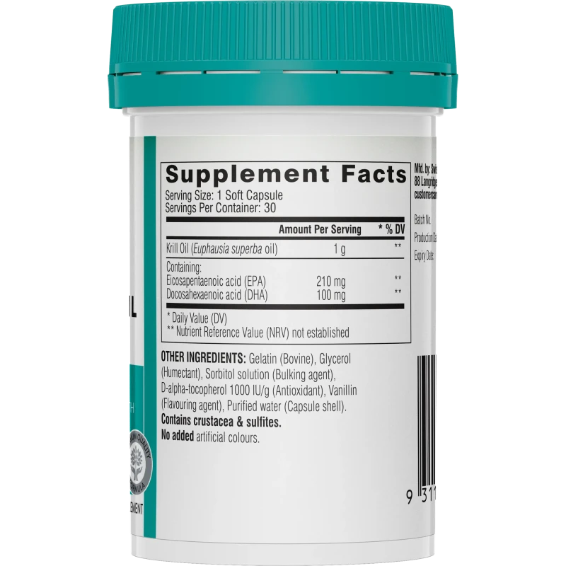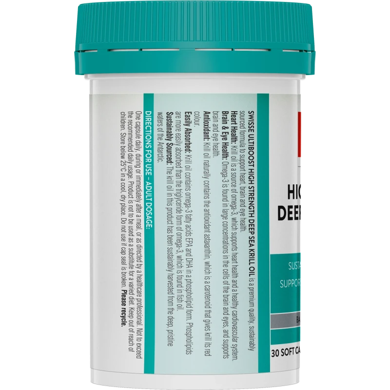 Introducing Swisse Ultiboost High Strength Krill Oil. Each capsule is crafted from krill oil rich in omega-3s to provide support for heart, brain, and eye health. With krill oil sustainably harvested from the Antarctic, this formula offers a daily dose of EPA and DHA in a phospholipid form that your body can easily embrace. Each soft gel capsule contains: Krill Oil (Euphausia superba oil) 1,000 mg.Introducing Swisse Ultiboost High Strength Krill Oil. Each capsule is crafted from krill oil rich in omega-3s to provide support for heart, brain, and eye health. With krill oil sustainably harvested from the Antarctic, this formula offers a daily dose of EPA and DHA in a phospholipid form that your body can easily embrace.Adult Dosage: One capsule daily, during or immediately after a meal, or as directed by a healthcare professional.May only provide a mild improvement in symptoms and take up to 6 months to see effects. If symptoms persist consult your healthcare professional. Derived from seafood. Always read the label and follow the directions for use. This medicine may not be right for you. Always read the label and any warnings before purchase. Follow the directions for use. If symptoms persist, talk to your health professional. Supplements may only be of assistance if dietary intake is inadequate.