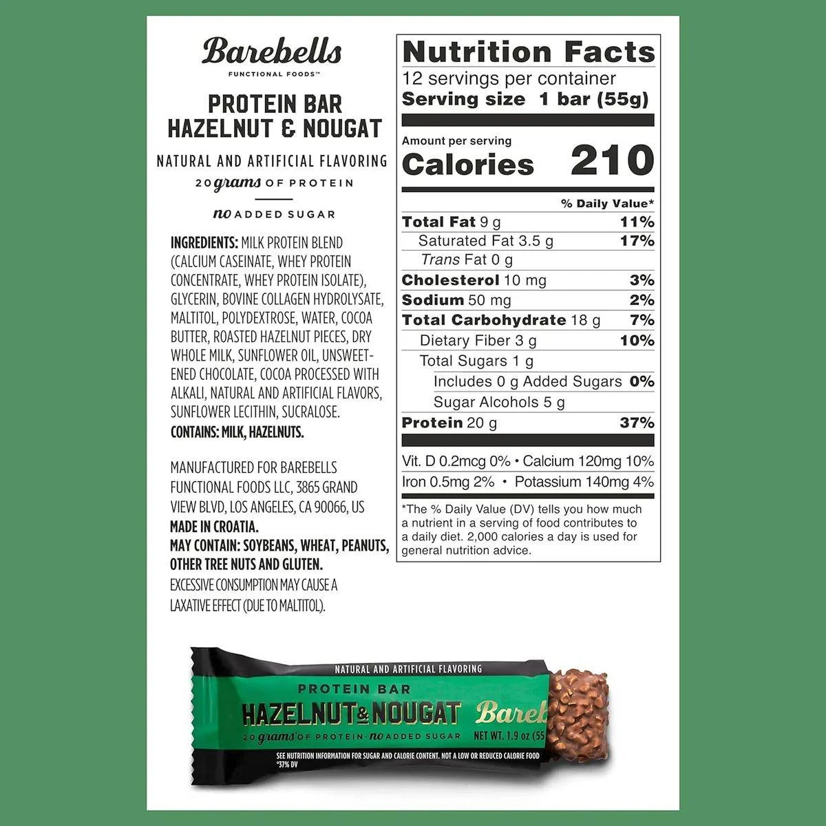 Barebells Hazelnut Nougat Protein Bar offers 20g of protein with no added sugar. Perfect for a tasty, nutritious snack anytime. Features 20 grams of protein No added sugar Natural and artificial flavoring Contains milk and hazelnuts Manufactured in Croatia May cause laxative effect due to maltitol Milk Protein Blend (Calcium Caseinate, Whey Protein Concentrate, Whey Protein Isolate), Glycerin, Bovine Collagen Hydrolysate, Maltitol, Polydextrose, Water, Cocoa Butter, Roasted Hazelnut Pieces, Dry Whole Milk, Sunflower Oil, Unsweetened Chocolate, Cocoa Processed with Alkali, Natural and Artificial Flavors, Sunflower Lecithin, Sucralose. Contains: Milk, Hazelnuts.Barebells: Known for delicious protein bars with no added sugar, combining taste and nutrition.Consume as a snack or post-workout protein boost.Excessive consumption may cause a laxative effect.