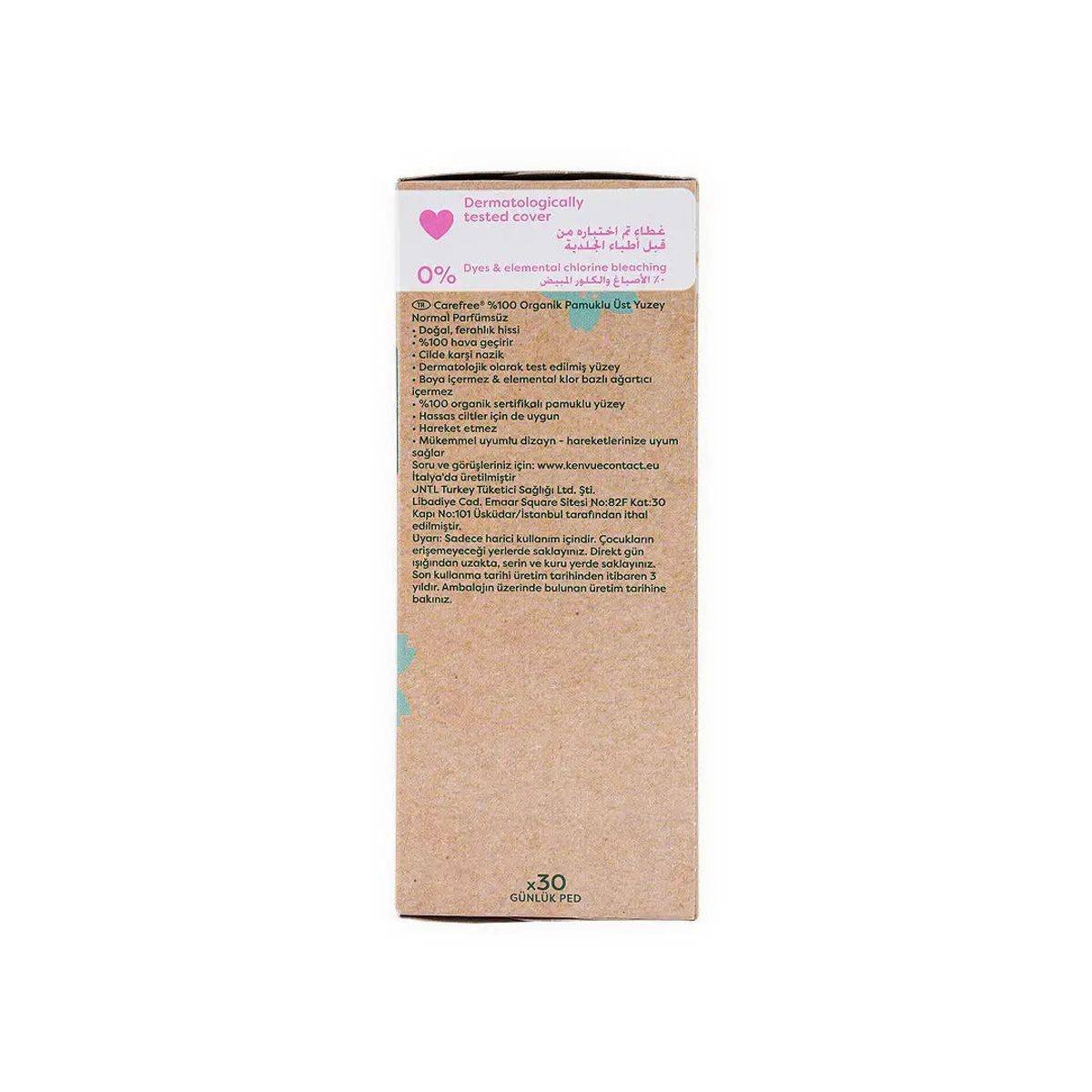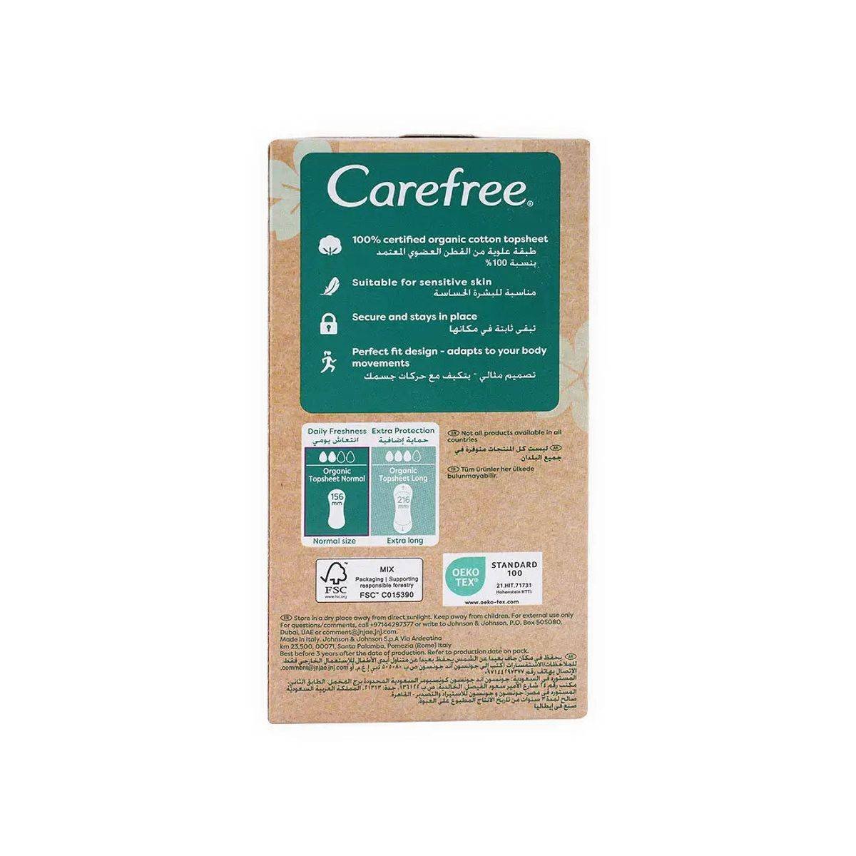 Carefree Organic Cotton Liners are designed for daily use, offering a natural, fresh feeling with 100% organic cotton topsheets. They are hypoallergenic and dermatologically tested, ensuring comfort for sensitive skin. The liners are fragrance-free, dye-free, and chlorine-free, promoting a gentle care experience. Perfect for maintaining freshness and protection throughout the day. Features 100% certified organic cotton topsheet Fragrance-free, dye-free, and chlorine-free Suitable for sensitive skin Breathable and hypoallergenic Secure fit, stays in place Perfect fit design, adapts to body movements Provides daily freshness and extra protection Made in Italy 100% Certified Organic Cotton TopsheetCarefree Organic Cotton Liners are designed for daily use, offering a natural, fresh feeling with 100% organic cotton topsheets. They are hypoallergenic and dermatologically tested, ensuring comfort for sensitive skin. The liners are fragrance-free, dye-free, and chlorine-free, promoting a gentle care experience. Perfect for maintaining freshness and protection throughout the day.Remove From Packaging, Peel Off The Protective Strip, And Attach To Your Underwear.For External Use Only. Keep Out Of Reach Of Children. Store In A Dry Place Away From Direct Sunlight. Best Before 3 Years After The Date Of Production. Refer To Production Date On Pack.