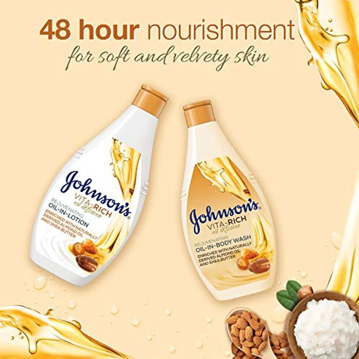 This non-greasy, fast-absorbing body lotion is enriched with almond oil, argan oil, and shea butter. It provides 48-hour hydration, leaving skin radiant and velvety soft. Key Features 48-hour nourishment Non-greasy formula Fast-absorbing Enriched with almond oil, argan oil, and shea butter Infused with rejuvenating fragrance Leaves skin radiant and velvety soft Aqua, Paraffinum Liquidum, Glycerin, Butyrospermum Parkii Butter, Prunus Amygdalus Dulcis Oil, Argania Spinosa Kernel Oil, Hydrogenated Palm Glycerides, Caprylyl Glycol, Carbomer, Potassium Cetyl Phosphate, P-Anisic Acid, Sodium Hydroxide, Phenoxyethanol, Parfum.Experts in skincare, offering gentle and nourishing products for soft and velvety skin.Apply Johnson'S Vita-Rich Rejuvenating Oil-In-Lotion After Shower Or Bath.For external use only. Discontinue use if irritation occurs.