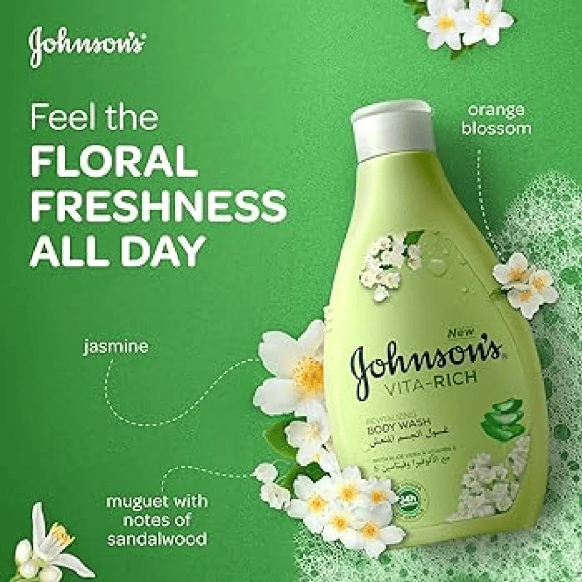 Johnson's Vita-Rich Revitalizing Body Wash is enriched with aloe vera and vitamin E to hydrate and refresh your skin. Its creamy formula provides 24-hour comfort, leaving your skin soft and smooth. Ideal for daily use on all skin types. Key Features Contains aloe vera and vitamin E Revitalizes and nourishes the skin Suitable for all skin types 24-hour comfort Rich and creamy formula Gently cleanses without drying Long-lasting moisturisation Fresh after-shower feeling Aqua, Sodium Laureth Sulfate, Cocamidopropyl Betaine, Sodium Chloride, Glycerin, Citric Acid, Sodium Benzoate, Parfum, Glycol Distearate, Hydroxypropyl Methylcellulose, Aloe Barbadensis Leaf Juice Powder, Hexyl Cinnamal, Benzyl Salicylate, Sodium Hydroxide, Tocopheryl Acetate, Potassium Sorbate, Sodium Sulfite [PR-0004834].Experts in skincare and personal care products, known for gentle and nourishing formulations.Place a small amount of the body wash onto your hands or a washcloth and massage your body. Rinse thoroughly.For external use only. Avoid contact with eyes. In case of contact with eyes, rinse thoroughly. Keep away from sunlight. Keep out of reach of children.