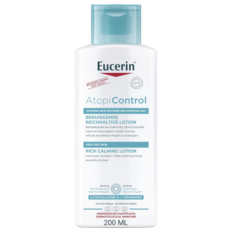 If you have dry and irritable skin, Eucerin AtopiControl range is a perfect solution during inactive phases as well as when flare-ups occur. Eucerin AtopiControl Rich Calming Body Lotion is an easily absorbed and water-in-oil lotion that helps hydrate, soothe and reduce skin discomfort and dryness caused by atopic dermatitis. Its rich formula contains essential ingredients that ease itchy and dry skin. Licochalcone A actively soothes and calms inflammations, Natural Omega Oils help stabilize skins natural protective barrier, and Ceramides strengthen skins barrier to prevent moisture loss. Experience intense moisturization, improved skin condition and a visibly smooth skin with daily and regular application of Eucerin AtopiControl Rich Calming Body Lotion. Its a perfect body lotion for dry skin that can be used once or twice daily or as adjunctive care to Eucerin AtopiControl Acute Care Cream during a flare-up. It is suitable for adults, children, and babies that are three months or over. To minimize the risk of skin irritation, Eucerin AtopiControl Body Lotion is made without harsh chemicals. It contains no fragrance, parabens and colorants, making it safe and gentle for use on newborn and fragile skin as well. The body lotion is clinically and dermatologically proven to be suitable for patients with atopic skin.