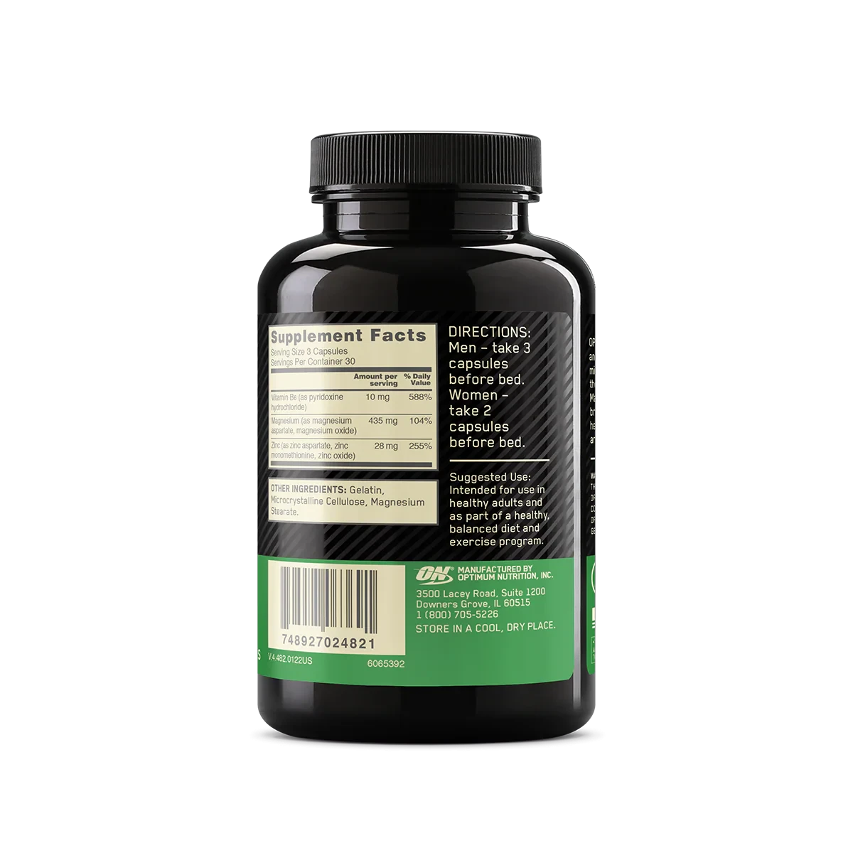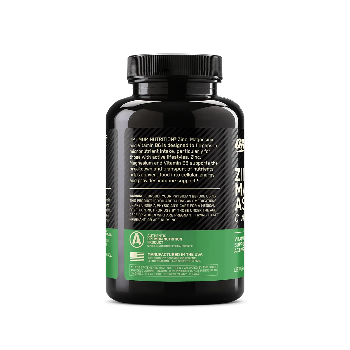 Zinc Magnesium Aspartate is a combination of zinc, magnesium and Vitamin B6. Optimum Nutrition Zinc Magnesium Aspartate is designed to fill gaps in micronutrient intake, particularly for those with active lifestyles. Optimum Nutrition Zinc Magnesium Aspartate supports the breakdown and transport of nutrients, and helps convert food into cellular energy. Additionally, zinc provides immune support. Vitamin B6 (as pyridoxine hydrochloride) Magnesium (as magnesium aspartate, magnesium oxide) Zinc (as zinc aspartate, zinc monomethionine)Zinc Magnesium Aspartate is a combination of zinc, magnesium and Vitamin B6. Optimum Nutrition Zinc Magnesium Aspartate is designed to fill gaps in micronutrient intake, particularly for those with active lifestyles. Optimum Nutrition Zinc Magnesium Aspartate supports the breakdown and transport of nutrients, and helps convert food into cellular energy. Additionally, zinc provides immune support.Men – take 3 capsules before bed. Women – take 2 capsules before bed. Intended for use in healthy adults as part of a healthy, balanced diet and exercise program.Keep out of reach of children. Check with a qualified healthcare professional before using this product if you are pregnant, nursing a baby, under 18 years of age, or if you have any known or suspected medical condition(s) and/or are taking any prescription or OTC medication(s).