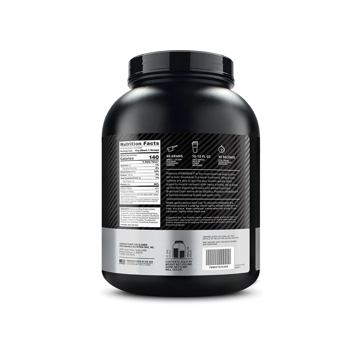 Platinum Hydrowhey® is the most advanced whey protein we've ever developed. In a word: Excellence. By hydrolyzing whey protein isolates to break larger proteins down into smaller pieces, these ultra-pure whey isolates are able to get into your system rapidly, enabling your muscles to start recovering from heavy training. We've dialed up this ultra pure and rapidly-digesting formula with added micronized Branched Chain Amino Acids (BCAAs). Hydrolyzed Whey Protein Isolates, Micronized Branched Chain Amino Acids (L-Leucine, L-Isoleucine, L-Valine), Natural and Artificial Flavors, Lecithin, Contains 1.5% or Less of: Creamer (Sunflower Oil, Maltodextrin, Modified Food Starch, Dipotassium Phosphate, Tricalcium Phosphate, Tocopherols), Salt, Cellulose Gum, Vanillin, Acesulfame Potassium, Sucralose, Enzyme Blend (Aminogen, Maltodextrin, Amylase, Protease, Cellulase, Beta-D-Galactosidase, Lipase)Platinum Hydrowhey® is the most advanced whey protein we've ever developed. In a word: Excellence. By hydrolyzing whey protein isolates to break larger proteins down into smaller pieces, these ultra-pure whey isolates are able to get into your system rapidly, enabling your muscles to start recovering from heavy training. We've dialed up this ultra pure and rapidly-digesting formula with added micronized Branched Chain Amino Acids (BCAAs).Platinum HYDROWHEY® is INSTANTIZED, so it mixes up completely and easily. Add 1 scoop of Platinum Hydrowhey® to a blender, shaker cup, or glass filled with 10-12 fl oz of cold water, milk, or juice and blend, shake, or stir for 20-30 seconds or until powder is dissolved. TIP: Use faster-acting Platinum HYDROWHEY during the day and more slow-digesting GOLD STANDARD 100% CASEIN at night or in between meals for around the clock amino coverage.Do not use as sole source of nutrition. Keep out of reach of children. ALLERGEN INFORMATION: Contains Milk And Soy (Lecithin) Ingredients.This product is labelled to United States standards and may differ from similar products sold elsewhere in its ingredients, labeling and allergen warnings