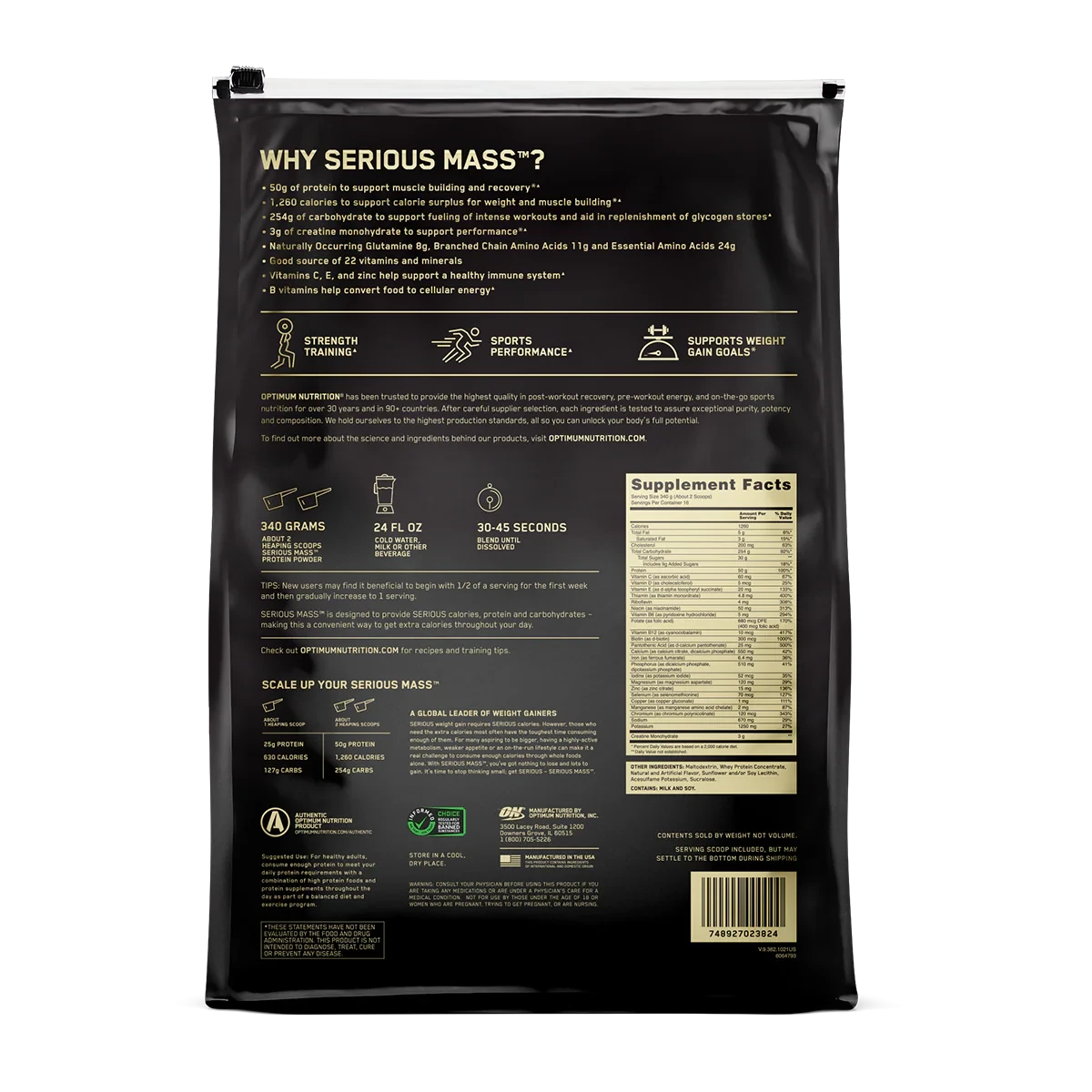 Optimum Nutrition Serious Mass is a high-calorie weight gainer which is also high in protein and when taken over time with regular resistance exercise and a balanced diet can help you gain mass and muscle. It also has creatine and glutamine to support Muscle building & recovery, when accompanied by a balanced diet and regular exercise. Maltodextrin, Protein Blend (Whey Protein Concentrate, Calcium Caseinate, Egg Albumin, Sweet Dairy Whey), Artificial Flavors, Vitamin and Mineral Blend (DiPotassium Phosphate, Magnesium Aspartate, DiCalcium Phosphate, Calcium Citrate, Ascorbic Acid, Niacinamide, Zinc Citrate, Beta Carotene, D-Calcium Pantothenate, D-Alpha Tocopheryl Succinate, Selenomethionine, Copper Gluconate, Ferrous Fumarate, Manganese Amino Acid Chelate, Thiamin Mononitrate, Pyridoxine Hydrochloride, Riboflavin, Chromium Polynicotinate, Folic Acid, Biotin, Molybdenum Amino Acid Chelate, Cholecalciferol, Potassium Iodide, Cyanocobalamin), Medium Chain Triglycerides, Lecithin, Acesulfame Potassium.Optimum Nutrition Serious Mass is a high-calorie weight gainer which is also high in protein and when taken over time with regular resistance exercise and a balanced diet can help you gain mass and muscle. It also has creatine and glutamine to support Muscle building & recovery, when accompanied by a balanced diet and regular exercise.Add 1 scoop of Serious Mass powder in 350ml water or juice and have it twice a day. Prepare using an electric blender. Add fresh or frozen fruits, peanut butter, nuts & other calorie-dense foods to boost your weight gain potential, Use post-workout and/or between meals to add calories, carbs, and protein to your healthy, balanced diet. Serious Mass is a substantial weight-gain supplement that can be used to feed serious calorie needs in a variety of different ways. Between Meals: Drink 1/2-1 serving of Serious Mass Weight Gainer between meals to maintain positive nitrogen balance and support a high-calorie diet. Post-Workout: Begin drinking 1/2-1 serving of Serious Mass 30-45 minutes following exercise to support maximum recovery. Before Bed: Drink 1/2-1 serving of Serious Mass about 45-60 minutes before bed to provide nutrients to recovering muscle throughout the night.Keep out of reach of children. Do not take this product if you are pregnant or nursing a baby. Check with a qualified healthcare professional before using this product if you are under 18 years of age or if you have any known or suspected medical condition(s) including diabetes, hypoglycemia, and/or if you are taking any prescription or OTC medication(s).