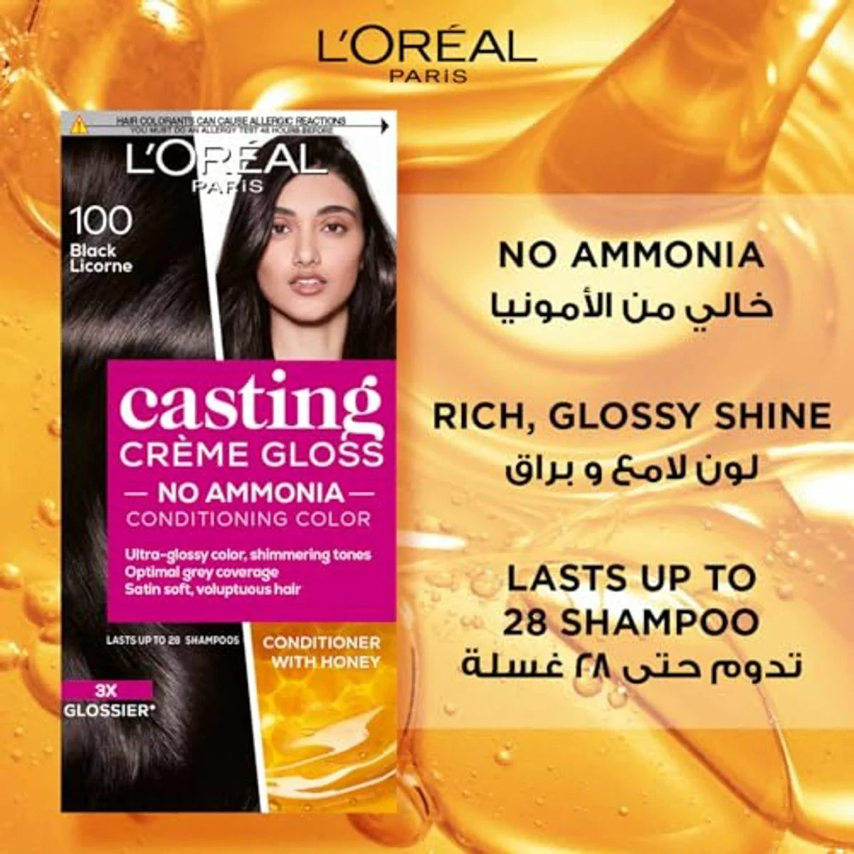 L'Oreal Paris Casting Creme Gloss 100 Black Licorice is a semi-permanent hair dye that offers a rich, glossy shine. Its ammonia-free formula blends away grey hair, leaving it soft and nourished. The color lasts up to 28 shampoos, providing a natural-looking result with shimmering tones. Key Features Ammonia-free formula Ultra-glossy color Optimal grey coverage Lasts up to 28 shampoos Conditioner with coconut oil Rich and glossy shine Soft and nourished hair Phenylenediamine, Resorcinol, Hydrogen Peroxide, Tint cream, Color developer, Balm with royal jelly.L'Oreal Paris: Innovators in hair color and beauty, known for ammonia-free, glossy hair color solutions.Mix Ammonia-Free Formula Dye Cream with the developer. Apply evenly, leave for 20-25 minutes. Rinse with lukewarm water, apply conditioner.A skin allergy test must be conducted 48 hours before each usage of this product (follow instructions).