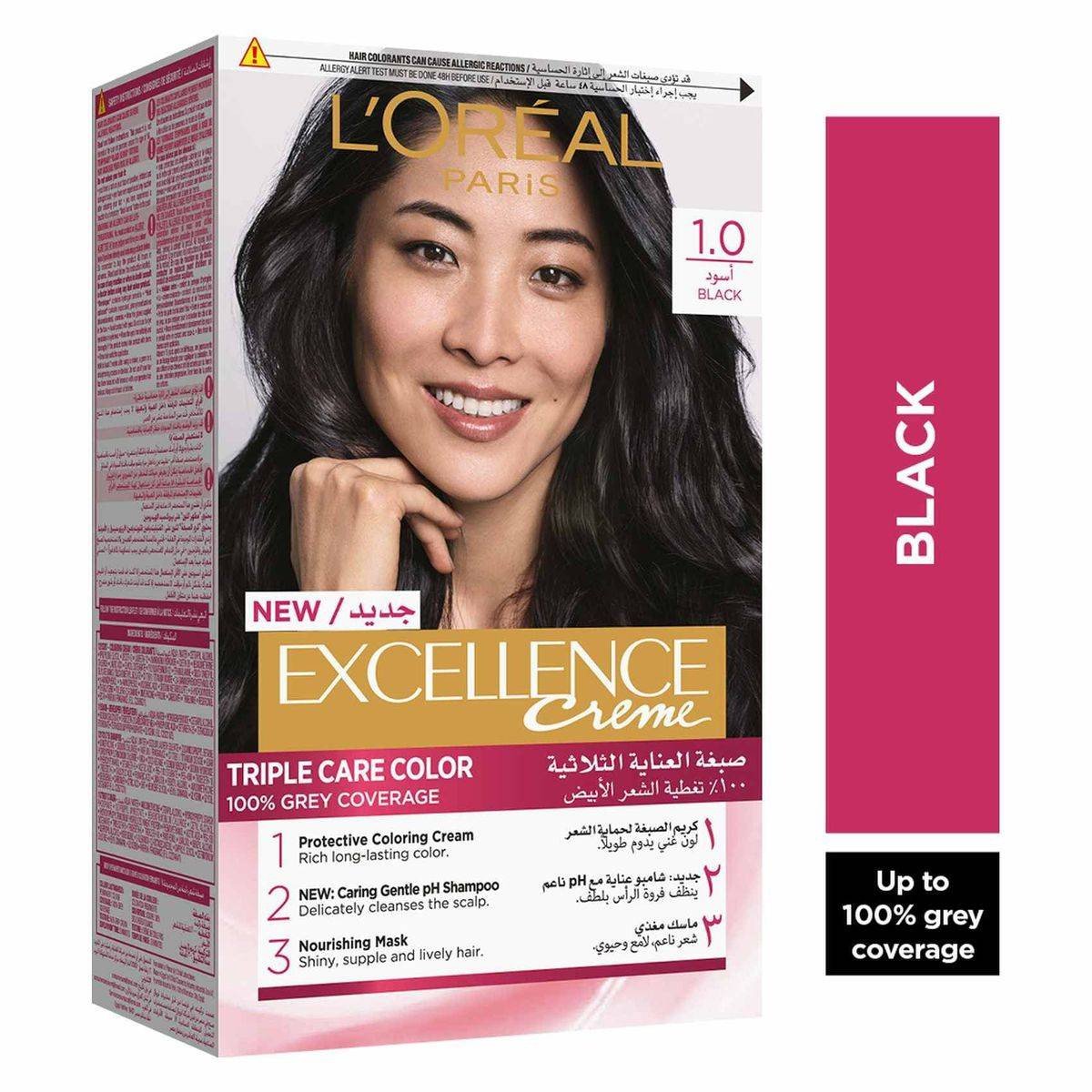 L'Oreal Paris Excellence Creme 1.0 Black offers a triple care formula with Ceramide, Pro-Keratin, and Collagen for rich, radiant color. Provides up to 100% grey coverage while nourishing and protecting hair for up to 6 weeks. Ideal for those seeking long-lasting, vibrant hair color with added shine and strength.