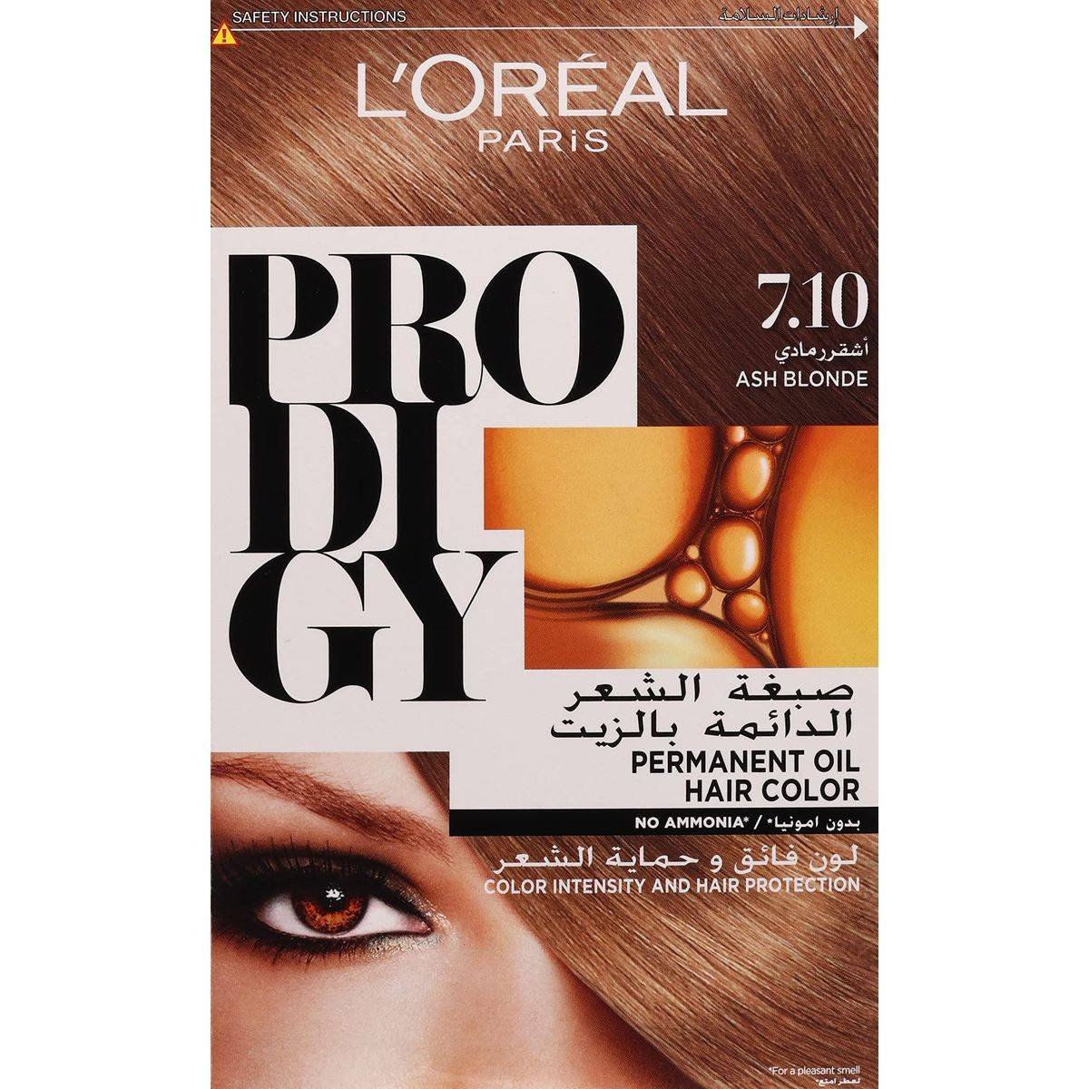 L'Oréal Paris Prodigy 7.1 Ash Blonde offers a sophisticated, multi-dimensional blonde shade with micro-oil technology for natural-looking color. Ammonia-free formula ensures gentle application and up to 100% gray coverage. Ideal for those seeking vibrant, salon-quality results at home. Features Reproduces natural hair color subtleties with highs and lows Permanent color with no ammonia Luxuriant color, exceptional shine, voluptuous touch Up to 100% grey coverage Micro-oil technology for natural-looking color Improved hair texture Paraffinum Liquidum, Aqua, Ethanolamine, Argania Spinosa Oil, and more.L'Oréal Paris: Innovators in beauty, offering a wide range of hair care and color products.Apply to dry, detangled hair using gloves. Section and apply from roots to ends. Process for recommended time based on desired result. Rinse thoroughly until water runs clear. Follow with provided conditioner for optimal care.Always perform a skin allergy test 48 hours before each use. Follow the instructions carefully. Do not use if you have previously experienced a reaction to hair colorants. Avoid contact with eyes; rinse immediately if product comes into contact with them.