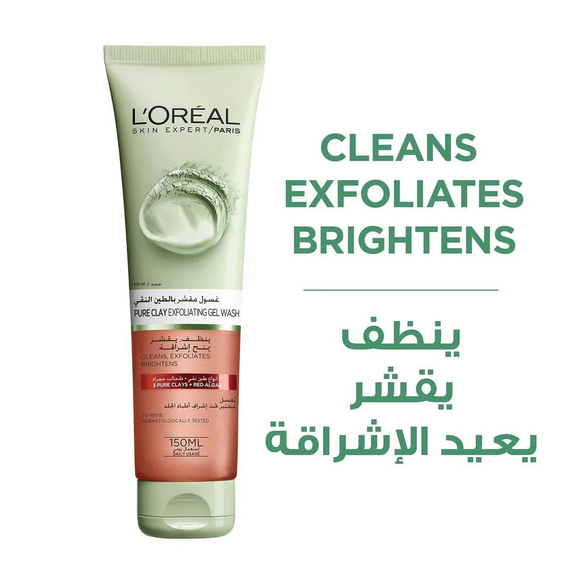 This exfoliating gel wash combines 3 pure clays and red algae to cleanse, exfoliate, and brighten skin. Dermatologically tested for daily use. Features