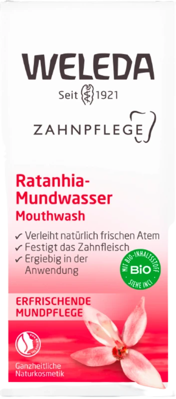 Weleda Ratanhia Mouthwash is a natural dental care solution that refreshes breath and strengthens gums. Made with organic ratanhia roots and myrrh, it tones and tightens gums while essential oils provide lasting freshness. Ideal for daily use, this vegan-friendly mouthwash is NaTrue certified for natural and organic cosmetics. Key Features Freshens breath and strengthens gums Contains natural plant extracts Economical concentrate NaTrue certified Includes essential oils Suitable for daily use Alcohol, Aqua, Commiphora Myrrha Resin Extract, Krameria Triandra Root Extract, Aroma, Limonene, Linalool, Eugenol, Aesculus Hippocastanum (Horse Chestnut) Bark Extract, Calcium Fluoride, Silver, Magnesium Sulfate.Weleda: Pioneers in natural cosmetics and holistic wellness since 1921.Use a few splashes in a half-full glass of lukewarm water for thorough rinse and gargle.Do not swallow, keep out of reach of children, and check ingredients for potential allergens before use.