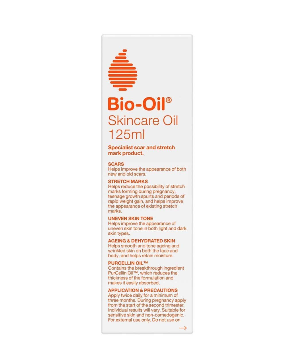 Bio Oil Skin Care Oil is a specialist scar and stretch mark product. It helps improve the appearance of both new and old scars, reduces the possibility of stretch marks forming, and improves uneven skin tone. Suitable for sensitive skin and non-comedogenic. Key Features Improves appearance of scars Reduces stretch marks Uneven skin tone improvement Anti-aging and hydration Contains Purcellin Oil Suitable for sensitive skin Paraffinum Liquidum, Triisononanoin, Cetearyl Ethylhexanoate, Isopropyl Myristate, Retinyl Palmitate, Helianthus Annuus Seed Oil, Tocopheryl Acetate.Bio Oil: Renowned for its specialist skincare oil, improving scars and stretch marks.Apply twice daily for a minimum of three months.For external use only. Do not use on broken skin.