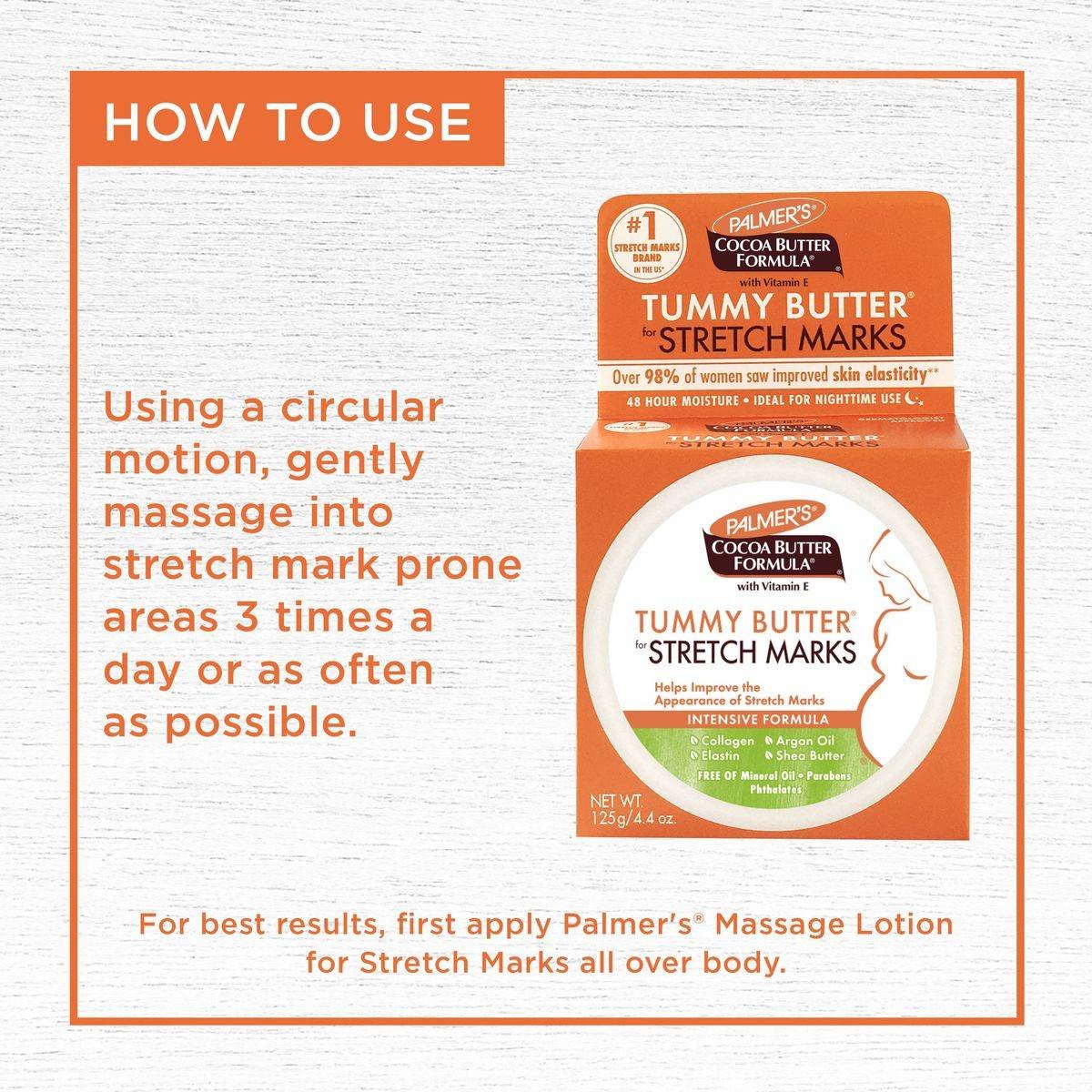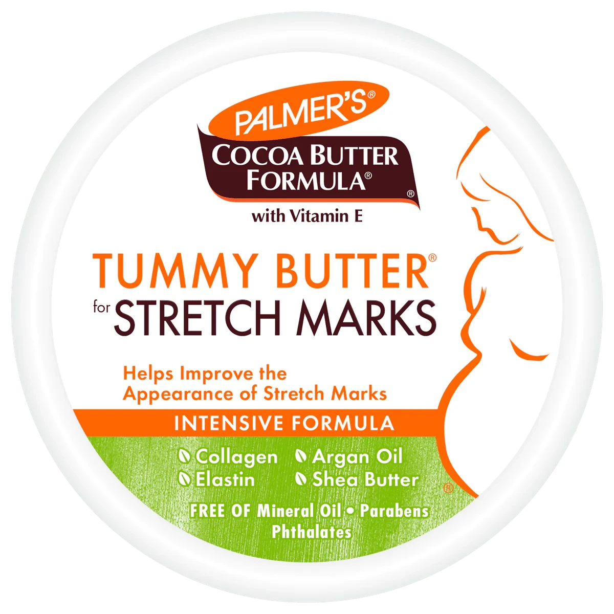 Palmer's Cocoa Butter Formula Tummy Butter is an intensive treatment for stretch marks, enriched with Cocoa Butter, Shea Butter, and Vitamin E. Ideal for nighttime use, it provides 48-hour moisture and helps improve skin elasticity. Features