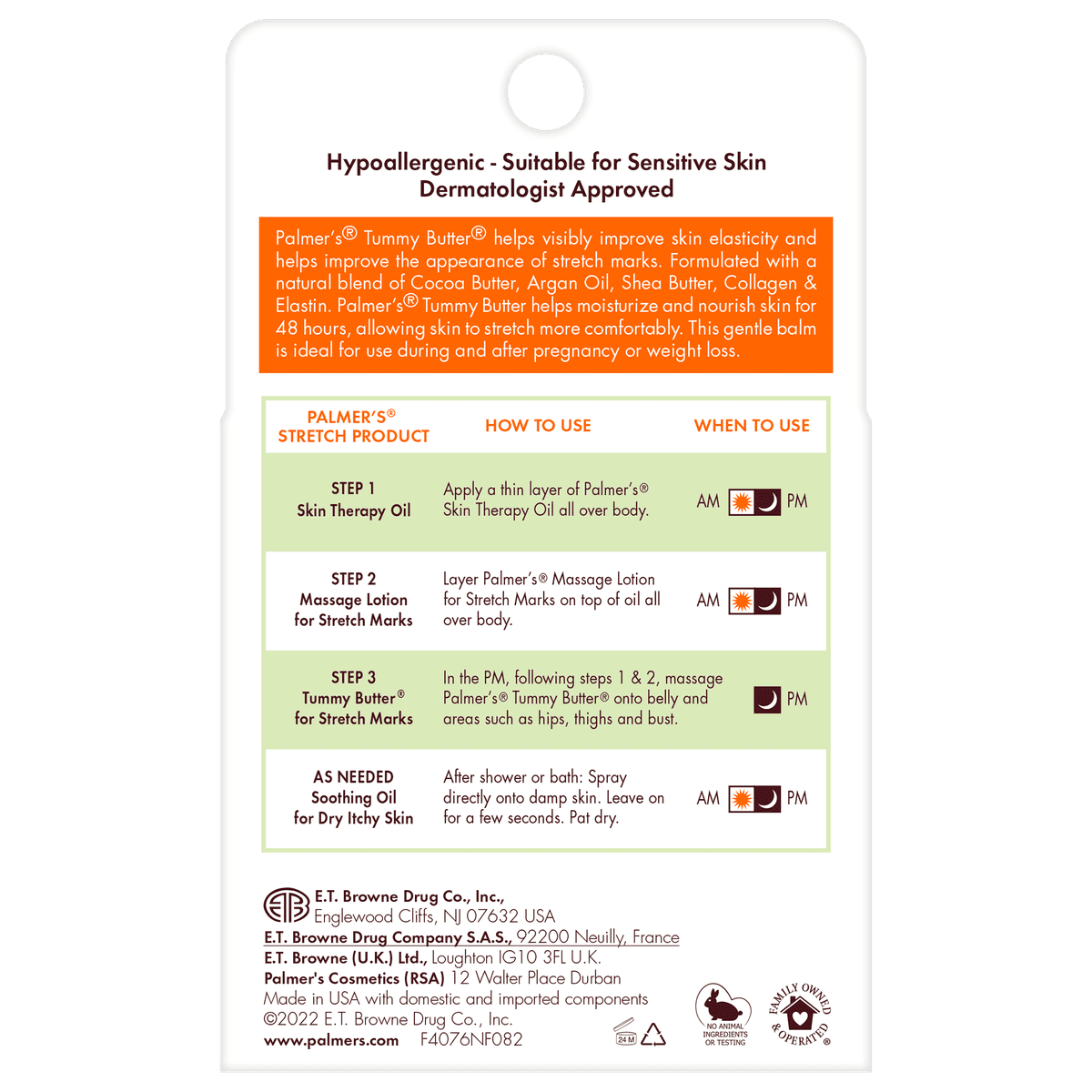 Cocoa Butter, Shea Butter, Natural Oils, Collagen, Elastin, Lutein, Argan Oil, Almond Oil, Natural Vitamin E, Cocoa Extract, Sunflower Seed Oil, Microcrystalline Wax, Cocoa Seed Butter, Sweet Almond Oil, Dimethicone, Centella Asiatica Extract, Safflower Seed Oil, Xanthophylls, Fragrance.Palmer's: Trusted skincare brand specializing in cocoa butter products for stretch marks and skin elasticity.Massage into stretch mark-prone areas 3 times a day or as often as needed.For external use only. Keep out of reach of children. Skin sensitivity may increase during pregnancy. Test the product on a small area, such as the inner forearm, 48 hours before first use.