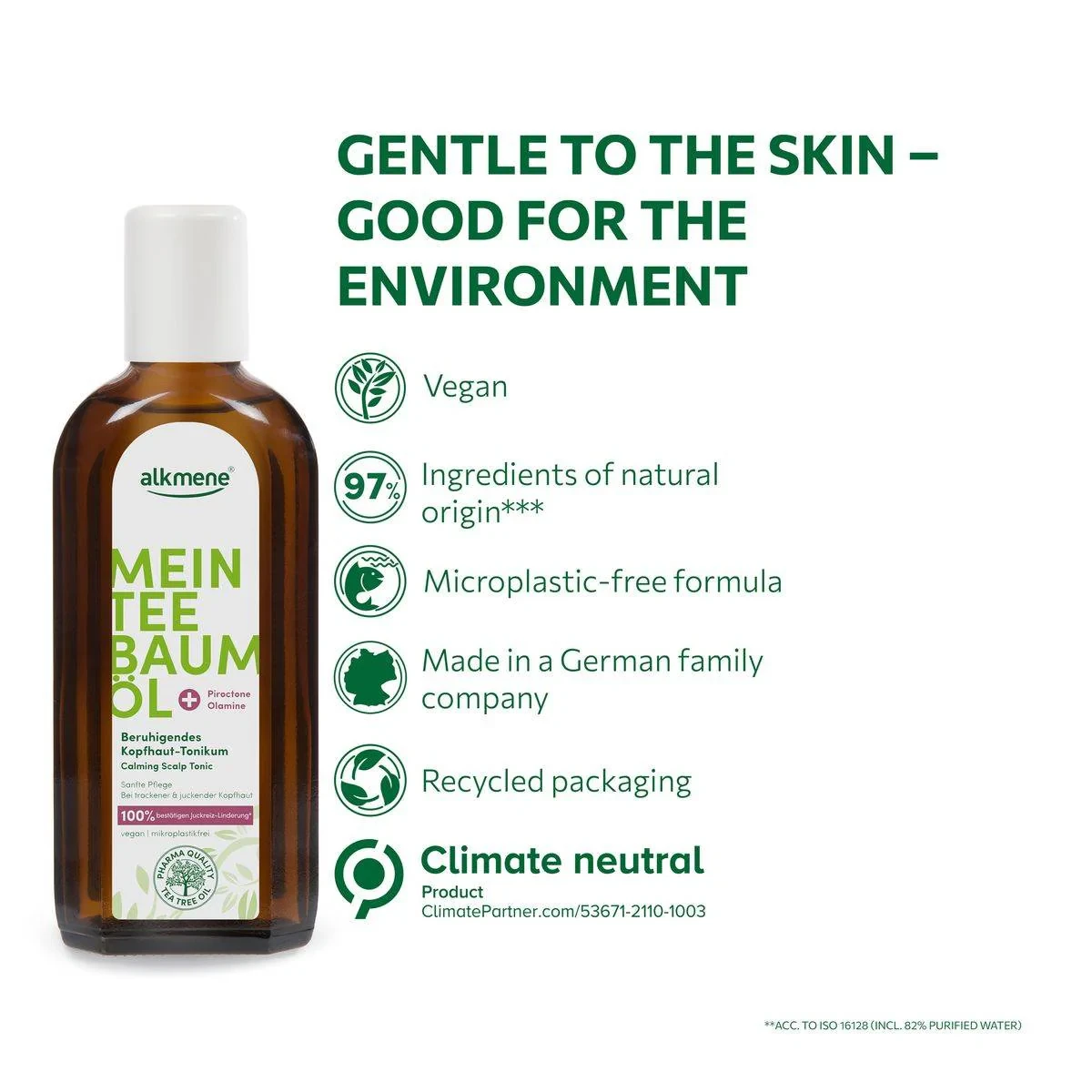 Alkmene Tea Tree Calming Scalp Tonic is designed to soothe and refresh the scalp. Infused with tea tree oil, it provides relief from scalp discomfort and promotes a healthier scalp environment. Suitable for daily use. Key Features Relieves itching Promotes healthier scalp Microplastic-free Vegan formula Made in Germany Antibacterial and antiseptic Moisturizes dry scalp Suitable for daily use Aqua (Water), Alcohol Denat., Panthenol, Melaleuca Alternifolia (Tea Tree) Leaf Oil, Parfum (Fragrance), Peg 40 Hydrogenated Castor Oil, Piroctone Olamine, Limonene, Citric Acid, Sodium Hydroxide.Alkmene: Natural personal care with a focus on scalp health using tea tree oil. Vegan and microplastic free.Apply daily to dry or towel dried scalp. Part hair and apply directly to the scalp. Do not rinse out.For External Use Only. Avoid Contact With Eyes. Discontinue Use If Irritation Occurs.