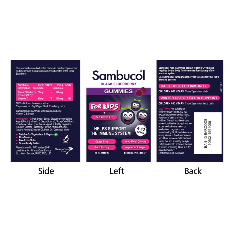 Delicious berry-flavoured gummies formulated with black elderberry, vitamin C, and zinc to support children’s immune health. A fun and easy way to help protect against seasonal changes while keeping kids strong and healthy. Suitable for daily use. Black Elderberry Extract (Sambucus nigra), Vitamin C, Zinc, Pure Cane Sugar.Immune support supplement made with Black Elderberry, formulated for children. Vegan-friendly, Gluten/Soy/Dairy/Nut-free.Daily Support: Children 2-3 years and older: Chew 1 gummy daily. Children 4+ years: Chew 1 gummy daily.