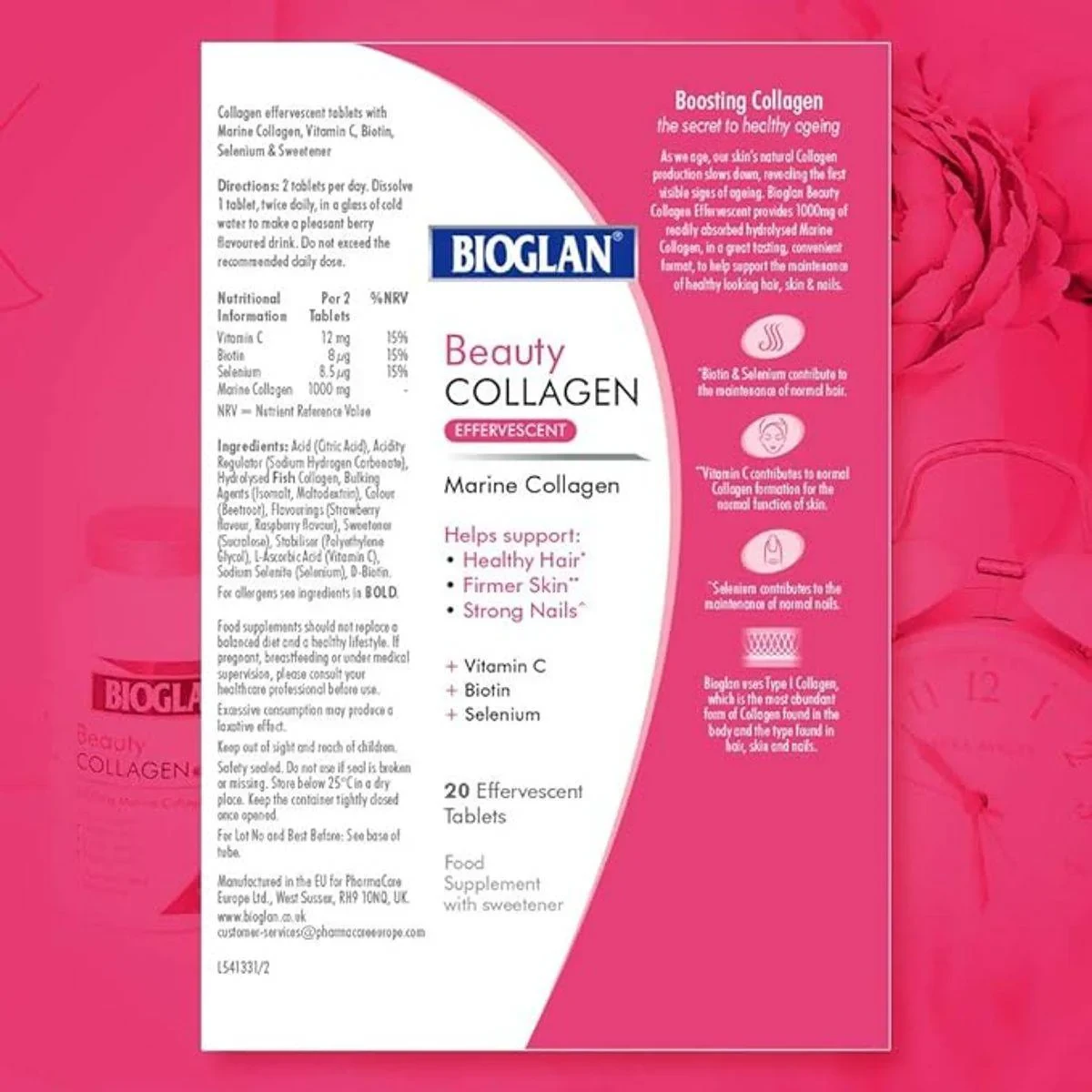 Acid (Citric Acid), Acidity Regulator (Sodium Hydrogen Carbonate), Hydrolysed Fish Collagen, Bulking Agents (Isomalt, Maltodextrin), Colour (Beetroot), Vitamin C, Biotin, Selenium.Bioglan: Experts in marine collagen supplements for healthy hair, skin, and nails.Dissolve 1 tablet twice daily in a glass of cold water to make a pleasant berry-flavored drink. Do not exceed the recommended daily dose.If pregnant, breastfeeding or under medical supervision, please consult your healthcare professional before use. Excessive consumption may produce a laxative effect. Keep out of sight and reach of children. Safety sealed. Do not use if seal is broken or missing.