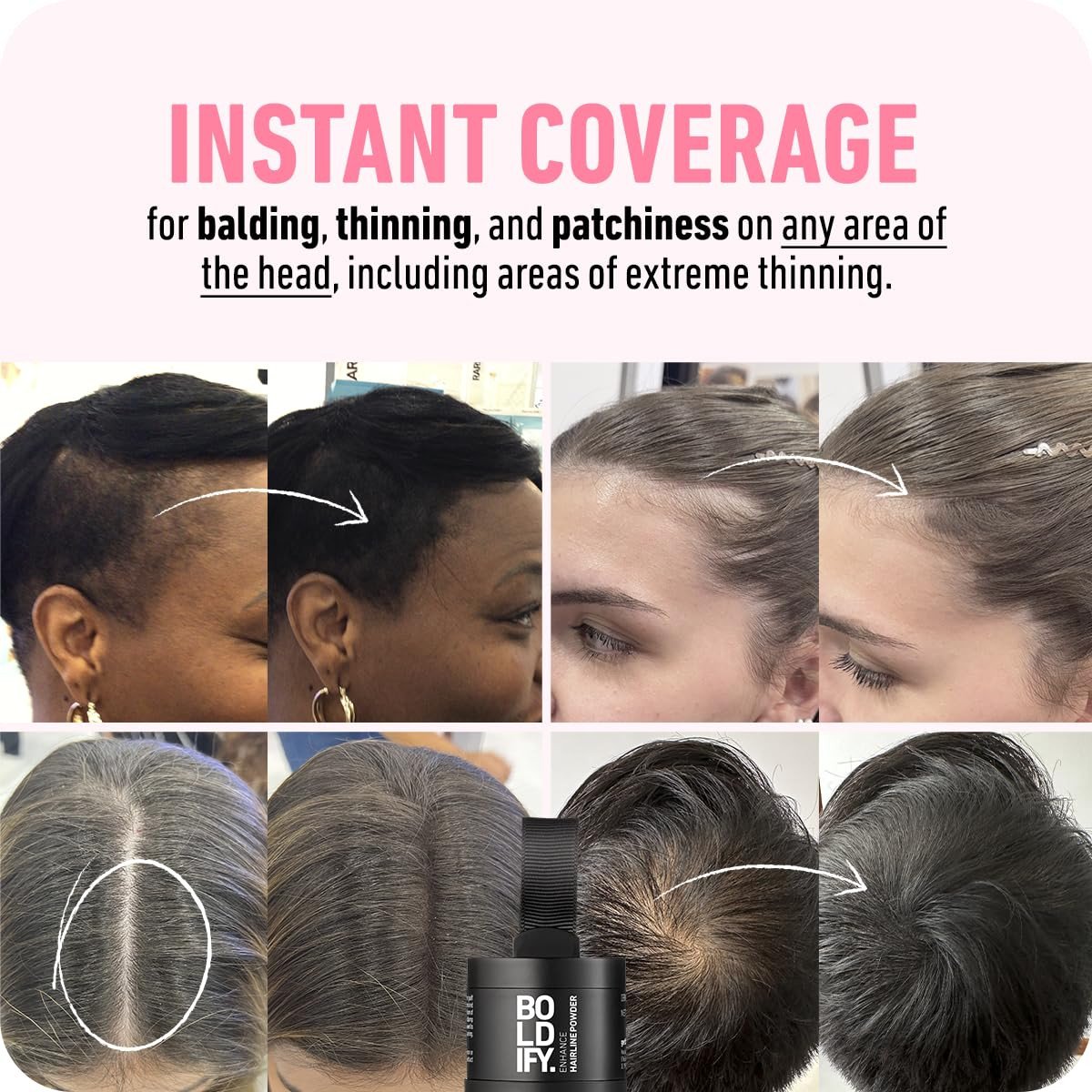 Boldify Hairline Powder is a compact solution for concealing root regrowth and thinning hair. It offers a natural look with a 48-hour hold, perfect for daily touch-ups. Features Conceals thinning hair and root regrowth 48-hour hold Water and sweat resistant Easy and mess-free application Scalp-safe formula Available in 14 shades Compact with built-in mirror Infused with conditioning squalane Mica, Talc, Silica, Squalane, Gossypium Herbarium Powder, Sodium Chloride.Boldify Hairline Powder is a compact solution for concealing root regrowth and thinning hair. It offers a natural look with a 48-hour hold, perfect for daily touch-ups.Remove The Puff Applicator, Press Onto Powder, Apply To Desired Areas, Blend In The Direction Of Hair Growth.Weather & Sweat Resistant To Stay Put Up To 24 Hours. Wind, Water, And Rain Resistant. Sweat Resistant. Won'T Stain Or Block Pores. Washes Out Easily With Shampoo.