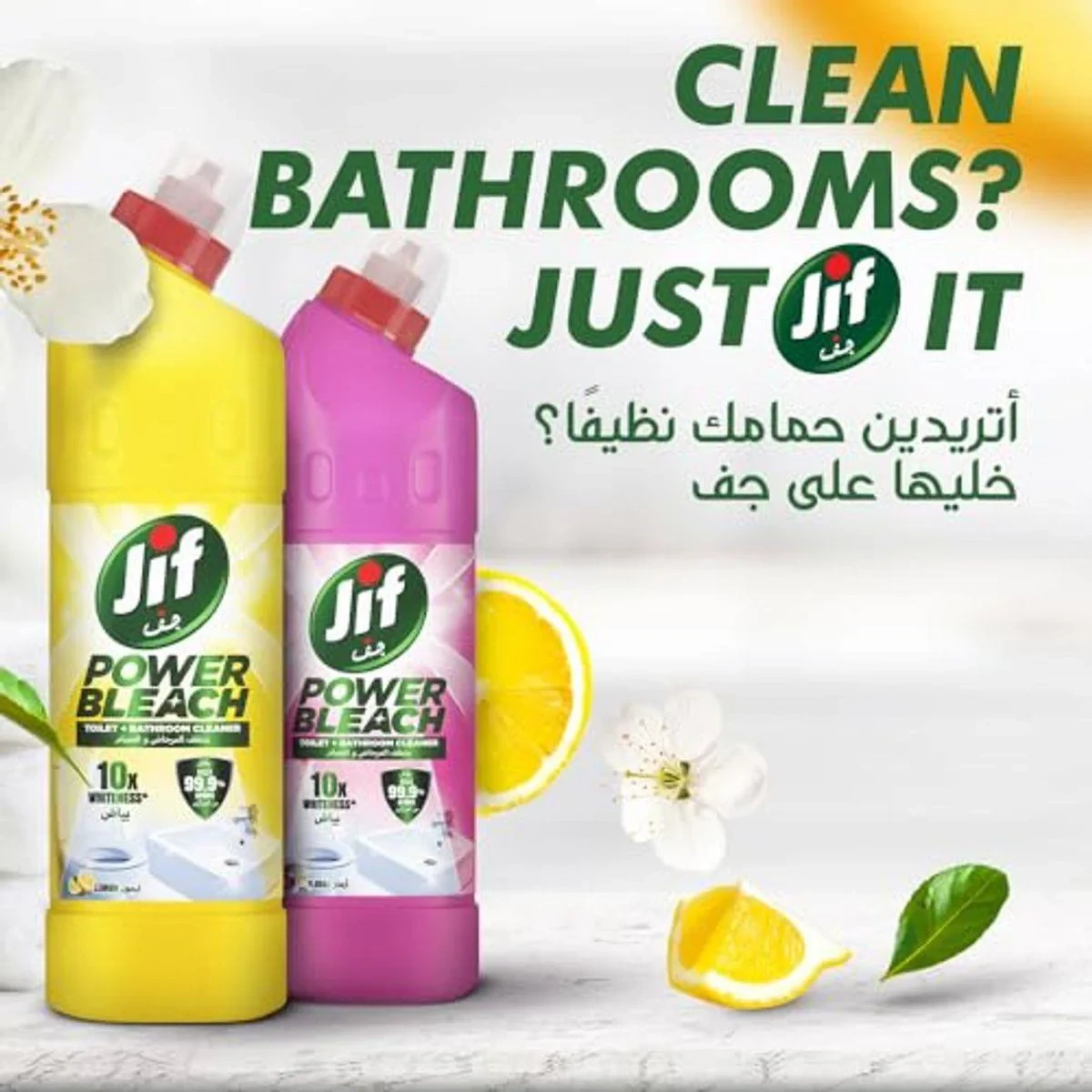 Jif Power Bleach Bathroom Lemon Breeze is a powerful cleaner designed to tackle tough stains and germs. With a refreshing lemon scent, it ensures 10x whiteness and kills 99.9% of germs, making it ideal for bathroom surfaces. Key Features Kills 99.9% of germs Brilliant shine & whiteness Removes stubborn stains 10x whitening power Suitable for toilets and bathrooms Chlorine-based bleach (Sodium Hypochlorite), Anionic Surfactants, Nonionic Surfactants, Perfume.Jif: Trusted for powerful cleaning solutions specializing in bathroom and kitchen care.1. Directly use; 2. DiluteKeep out of reach of children.