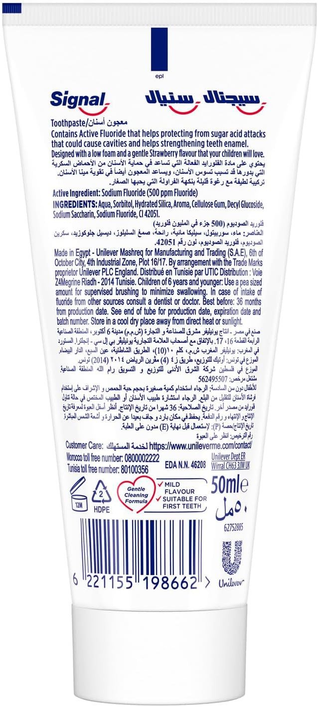 Signal Kids Strawberry Toothpaste is designed to make brushing enjoyable for children. With its mild strawberry flavor, it encourages kids to develop good oral hygiene habits while providing effective protection against cavities. Key Features Fun strawberry flavor Gentle on kids’ teeth & gums Fluoride protection No harsh ingredients Low foam formula Protects milk teeth Strengthens enamel Encourages healthy oral care habits Sorbitol, Aqua (Water), Hydrated Silica, Peg-32, Sodium Lauryl Sulfate, Aroma (Flavour), Cellulose Gum, Sodium Saccharin, Sodium Fluoride, Mica, Calcium Gluconate, Tocopheryl Acetate, Glycerin, Limonene, Phenylcarbinol, Ci 12490, Ci 77891.Signal Kids Strawberry Toothpaste is designed to make brushing enjoyable for children. With its mild strawberry flavor, it encourages kids to develop good oral hygiene habits while providing effective protection against cavities.Apply A Pea-Sized Amount Of Toothpaste To A Soft-Bristled Toothbrush. Brush Teeth Gently For Two Minutes, Twice A Day. Rinse Thoroughly With Water.For External Use Only. Do Not Swallow. Keep Out Of Reach Of Children.