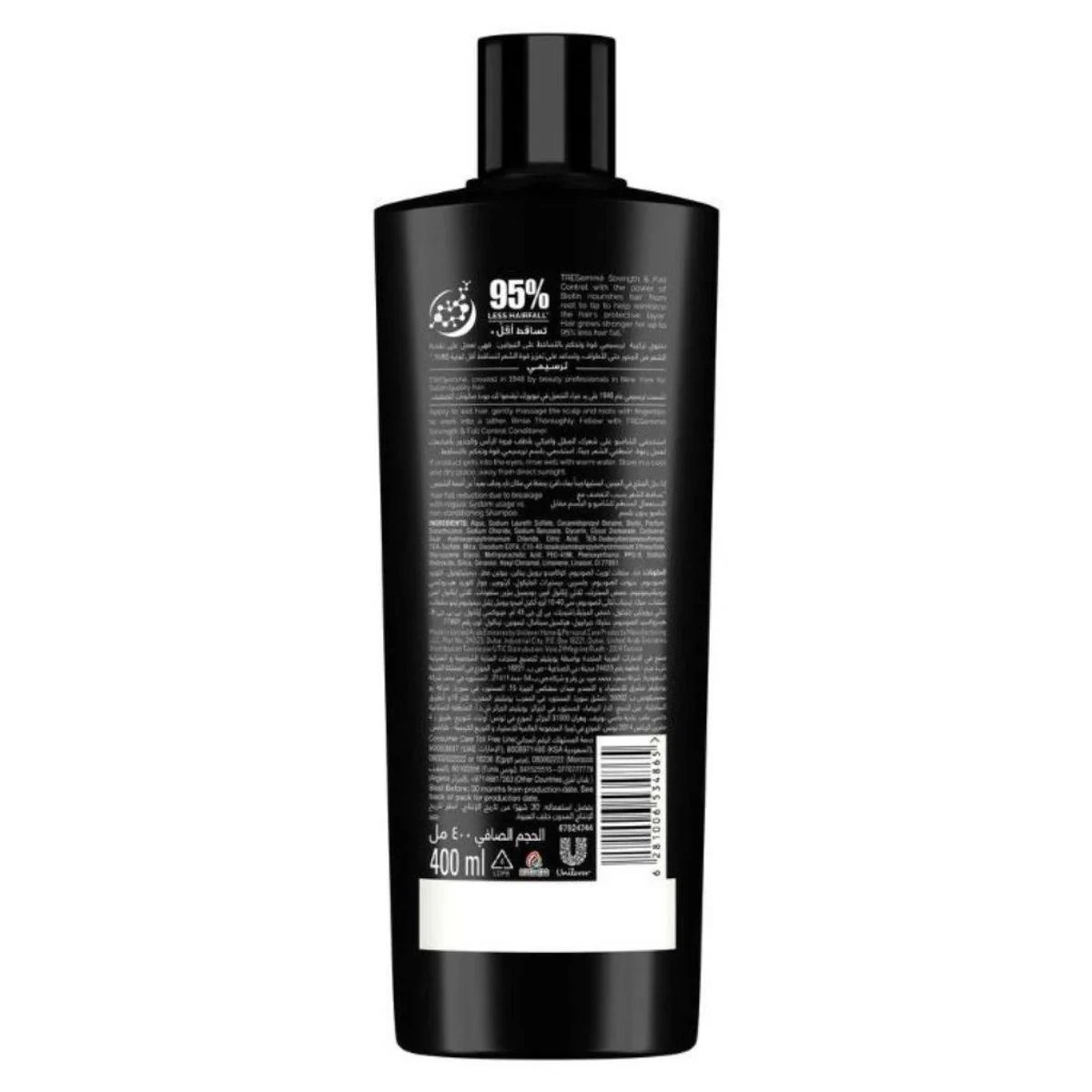 Aqua, Sodium Laureth Sulfate, Cocamidopropyl Betaine, Biotin, Parfum, Dimethiconol, Sodium Chloride, Sodium Benzoate, Glycerin, Glycol Distearate, Carbomer, Guar Hydroxypropyltrimonium Chloride, Citric Acid, Tea-Dodecylbenzenesulfonate, Tea-Sulfate, Mica, Disodium Edta, C10-40 Isoalkylamidopropylethyldimonium Ethosulfate, Dipropylene Glycol, Methylarachidic Acid, Peg-45M, Phenoxyethanol, Ppg-9, Sodium Hydroxide, Silica, Geraniol, Hexyl Cinnamal, Limonene, Linalool, Ci 77891.TRESemmé Strength & Fall Control Shampoo is enriched with Biotin to make hair 3x stronger and reduce hair fall by 95%. Ideal for all hair types, it nourishes from root to tip and protects against heat styling.Apply Shampoo, Follow With Conditioner, And Use A Heat Protector Before Styling.