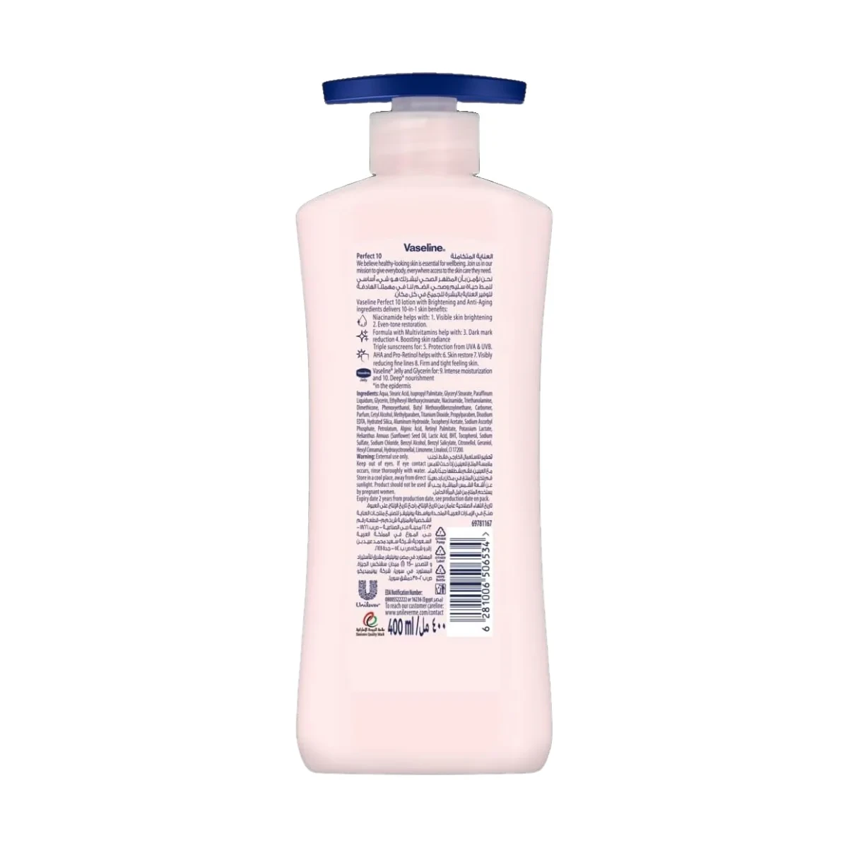 Vaseline Body Lotion Essential Even Tone Perfect 10 is a 400ml lotion that offers 10-in-1 skin benefits. It contains Vitamin B3 and AHA exfoliants for brightening and reducing uneven skin tone. The non-greasy formula absorbs quickly, providing long-lasting hydration and a radiant, even-toned look. Ideal for daily use on all skin types. 10-in-1 skin benefits Brightening and anti-aging effects Contains natural Vitamin B3 Reduces uneven skin tone and dark spots AHA exfoliants for youthful appearance Vaseline jelly for skin restoration Non-greasy formula Fast absorption Suitable for all skin types Deep moisturization Water, Niacinamide (Vitamin B3), Glycerin, Stearic Acid, Glyceryl Stearate, Vaseline Jelly Micro-Droplets, Mineral Oil, Isopropyl Palmitate.Vaseline: Trusted for skin healing and protection