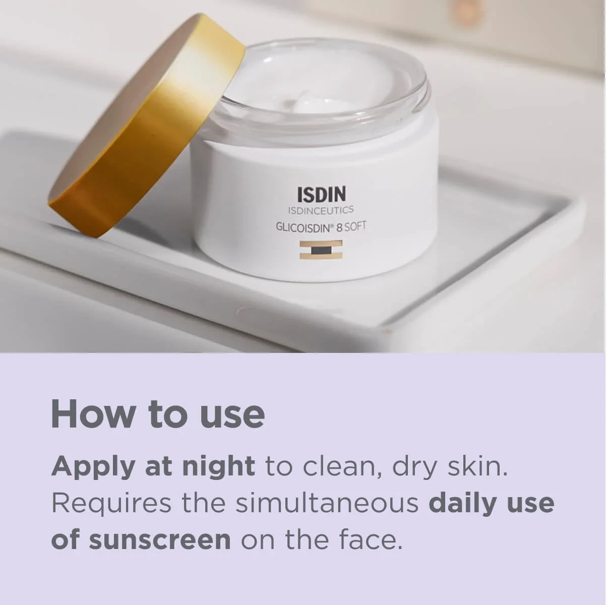 ISDIN Isdinceutics Glicoisdin 8 Soft Cream is an exfoliating glycolic acid cream designed to refine skin texture and smooth fine lines. It hydrates and revitalizes dry, dull skin, making it suitable for all skin types. Key ingredients include glycolic acid, borage oil, and vitamin E. Key Features Exfoliating glycolic acid face cream Refines skin texture Smooths appearance of fine lines Boosts hydration Enhances skin elasticity Revitalizes dry, dull-looking skin Dermatologist-tested Suitable for all skin types Glycolic Acid 3.2%, Ceramide, Borage Oil, Vitamin E.ISDIN is a renowned skincare brand specializing in dermatological solutions for skin health and beauty.Apply at night to clean, dry skin. Use every other night for the first week, then nightly. Use daily sunscreen.Requires The Simultaneous Daily Use Of Sunscreen On The Face.