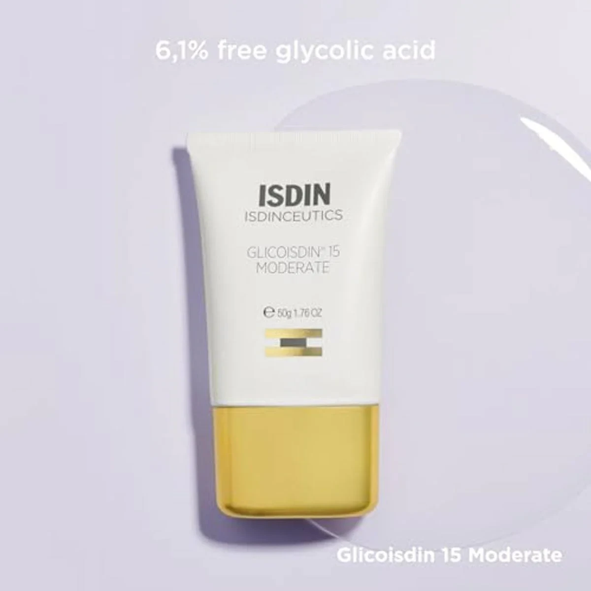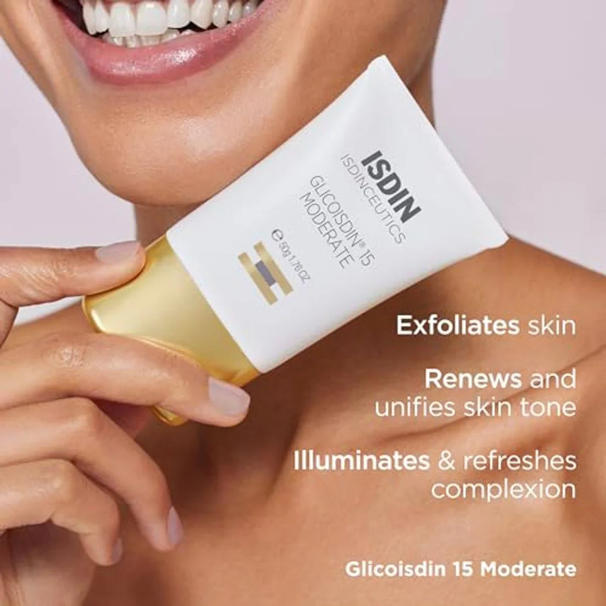 Isdin Isdinceutics Renew Glicoisdin 15 Moderate Facial Cream is a powerful exfoliating cream with 6.1% free glycolic acid. It helps renew skin texture, reduce fine lines, and improve elasticity. Enriched with Aloe Vera and Borage Oil, it hydrates and soothes, making it ideal for all skin types. Apply at night for best results, and use sunscreen during the day. Key Features 6.1% free glycolic acid Exfoliates and renews skin Improves skin texture Reduces fine lines and wrinkles Hydrates and increases elasticity Alcohol-free Dermatologically tested Suitable for combination skin Non-greasy, easily absorbed texture Promotes radiance and luminosity Aqua (Water), Alcohol Denat., Glycolic Acid, Butylene Glycol, Aloe Barbadensis Leaf Juice, Ammonium Hydroxide, Hydroxyethylcellulose, Disodium EDTA, Potassium Sorbate, Sodium Benzoate.Isdin: Innovators in skincare, combining dermatology and aesthetics for effective anti-aging solutions.Apply in the evening to cleansed skin, massaging gently until absorbed. Use sunscreen during the day.AHA/GLYCOLIC ACID WARNING: May increase sun sensitivity. Use sunscreen and limit sun exposure. For external use only.