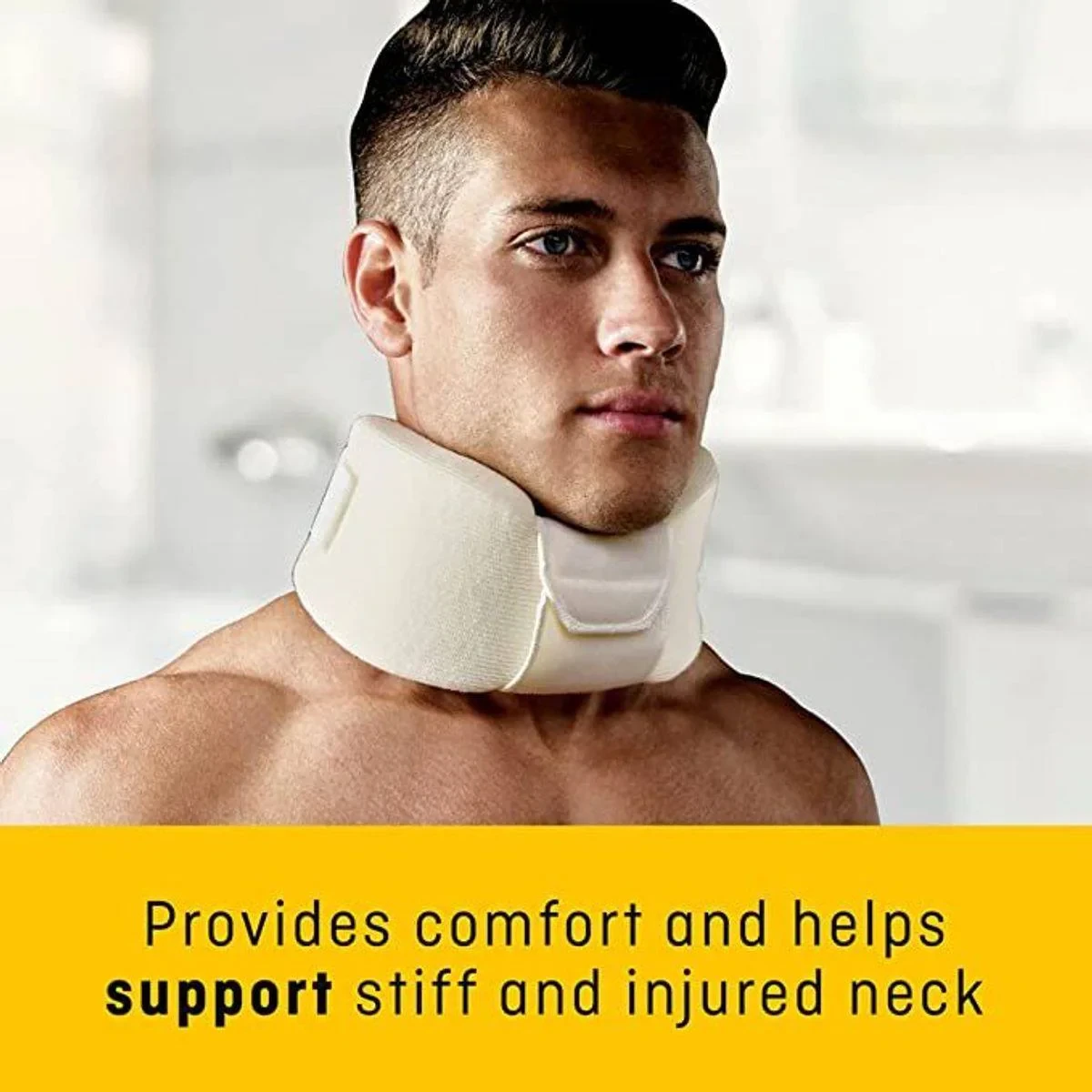 The Futuro Soft Cervical Collar is designed to provide moderate support for neck injuries such as whiplash and pinched nerves. It features an adjustable fit with a hook-and-loop closure for customized sizing and a contoured design for improved alignment. Made from soft foam, it offers cushioned support and comfort for day or night use. Ideal for recovery from neck injuries, the collar is breathable and suitable for prolonged wear. Key Features Adjustable straps for height and circumference Breathable foam covered with soft, smooth knit material Provides moderate support to an injured neck Suitable for day or night use Nylon, Modal Acrylic, Polyurethane, Polyester, Cotton.Futuro offers innovative orthopedic support products, specializing in neck and joint care solutions.Hold in both hands with the chin strap flap facing away and hook fastener in the right hand. Place collar at the front of the neck, with the chin strap under the chin. Wrap the left end around the neck and attach to the opposite end. Extend the soft pile strip to overlap and engage the hook fastener. Adjust fasteners until fit is firm yet comfortable. Adjust the chin strap for comfort and support.Consult your healthcare practitioner if symptoms persist.