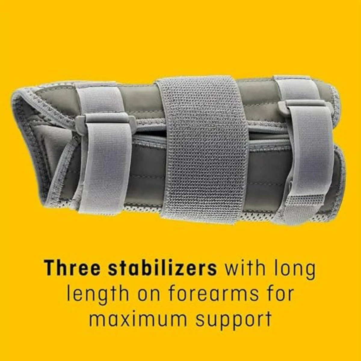 The FUTURO Deluxe Wrist Stabilizer provides firm support to injured wrists and helps relieve symptoms of Carpal Tunnel Syndrome. It features dorsal stabilizers for enhanced support and adjustable straps for a custom fit. Made with breathable materials, it allows free movement of fingers and is suitable for all-day wear. Firm support for injured wrists Relieves symptoms of Carpal Tunnel Syndrome Adjustable straps for custom comfort Breathable materials for all-day wear Allows free movement of fingers Foam pad in palm for comfort Three stabilizers for maximum support Polyester, Vinyl, Neoprene Blend, Nylon, Cotton, Spandex.Futuro specializes in providing firm support and relief for wrist injuries, including Carpal Tunnel Syndrome.Loosen all fasteners and the wrap-around strap. Slide hand into the brace with wide vinyl strip running along palm side of wrist. Ensure thumb is in the thumb hole and the splint rests comfortably in the palm. Tighten slide-guard fasteners. Wrap the middle strap around wrist. Adjust all straps until fit is firm, yet comfortable.If symptoms persist, consult your healthcare professional.