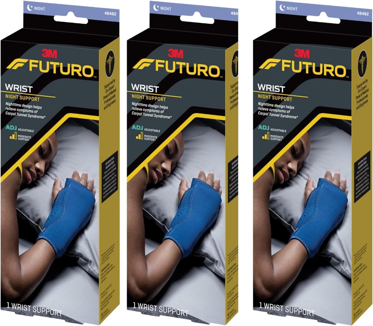 The Futuro Night Wrist Sleep Support is designed to relieve symptoms of carpal tunnel syndrome and arthritis during sleep. It features cushioning beads for a neutral hand position and an adjustable palmar stabilizer for customizable support. Made from soft, moisture-wicking materials, it ensures comfort throughout the night. Key Features Moderate support for injured wrists Helps relieve symptoms of Carpal Tunnel Syndrome Plush cushioning for wrist protection during sleep Innovative cushioning beads for neutral hand position Removable palmar splint for customizable support Easy-to-use sleeve design Fits either wrist Supported by engineers and medical professionals Aluminum, Nylon, Polyester, Polystyrene, Polyurethane Foam, Spandex.Futuro specializes in innovative support solutions for wrist and joint health.Open fasteners, slide hand into support with metal splint positioned along palm, close center fastener, adjust until fit is firm. Spread the bead pouch to promote a neutral hand position.This is a medical device. Consult the device's user-manual for detailed information regarding instructions for use, indications, contraindications, warnings, precautions, and potential adverse events.