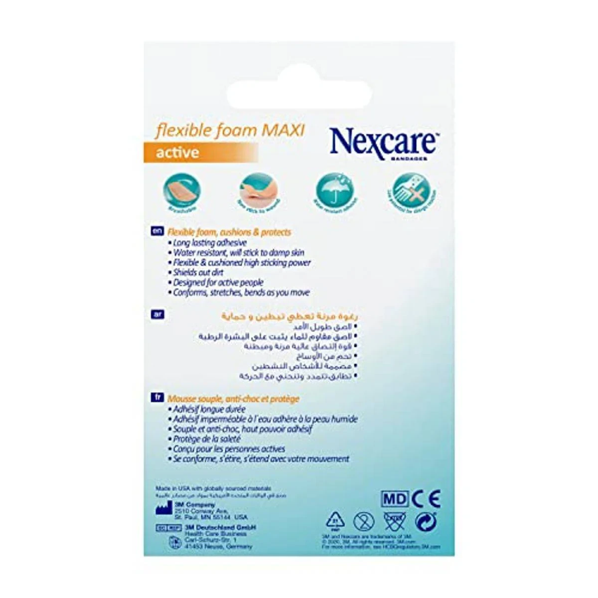 Nexcare Bandages Active 360 Maxi are designed for active individuals, providing cushioning and protection for cuts and scrapes. These waterproof bandages stick to damp skin and feature a flexible foam that stretches and bends with movement, ensuring comfort during sports or humid conditions. Flexible foam cushions and protects Waterproof and sticks to damp skin Designed for active people Long-lasting adhesive Unique shape for better seal Key Materials: Flexible Nylon/Spandex/Polyester fabric backing (360 degree stretch); Strong adhesive; Non stick pad.Nexcare offers innovative bandages designed for active lifestyles, providing protection and comfort.Apply To Clean, Dry Skin. Replace As Needed Or When Bandage Becomes Wet Or Dirty.Discontinue use immediately if a rash or irritation occurs. For single use only. Consult a doctor if the wound does not heal or if signs of infection occur.