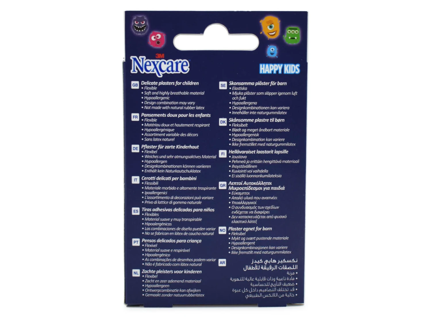 Nexcare Bandages Happy Kids Monster are designed for children, offering flexible and breathable protection. These hypoallergenic plasters are not made with natural rubber latex, ensuring safety for sensitive skin. Ideal for minor cuts and abrasions, they provide comfort and fun with varying designs. Key Features Delicate plasters for children Flexible and soft material Highly breathable Hypoallergenic Design combination may vary Not made with natural rubber latex Key Materials: Plastic/Sheer backing with printed design; Non stick pad; Adhesive.Nexcare offers innovative healthcare solutions with a focus on comfort and protection.Apply bandage to clean, dry, minor cuts or scrapes. Change bandage daily or when wet/dirty.Not Made With Natural Rubber Latex.