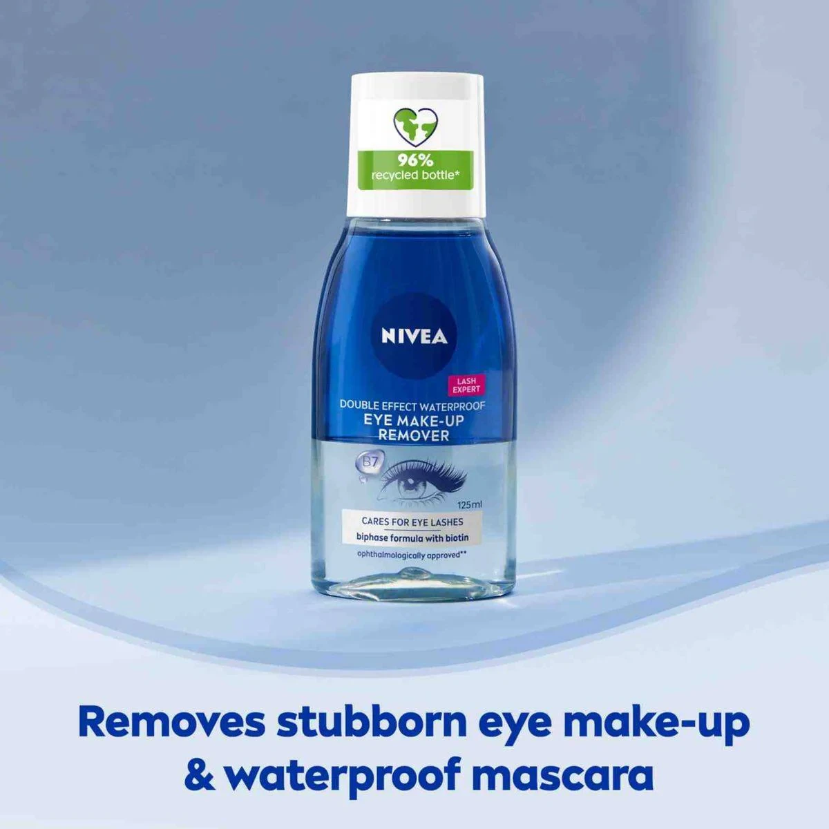 Nivea Eye Makeup Remover Double Effect 125ml is designed to remove waterproof and long-lasting makeup effortlessly. Its bi-phase formula with Biotin cares for eyelashes and eyebrows, leaving the eye area clean and healthy. Suitable for all skin types, including sensitive skin. Key Features Effective in removing waterproof mascara Non-irritating and gentle on eyes Non-oily, silky texture Bi-phase formula with Biotin Water/Aqua/Eau, Phenoxyethanol, Dimethicone, Sodium Chloride, Benzethonium Chloride, Caprylyl/Capryl Glucoside, Centaurea Cyanus Flower Extract, Helianthus Annuus Seed Oil, Isododecane, Isopropyl Palmitate, Trisodium Edta.Nivea: Trusted skincare brand known for gentle, effective products.Shake Well Before Use. Apply To A Cotton Pad And Swipe Gently.For external use only. If irritation occurs, discontinue use. Avoid getting into eyes.