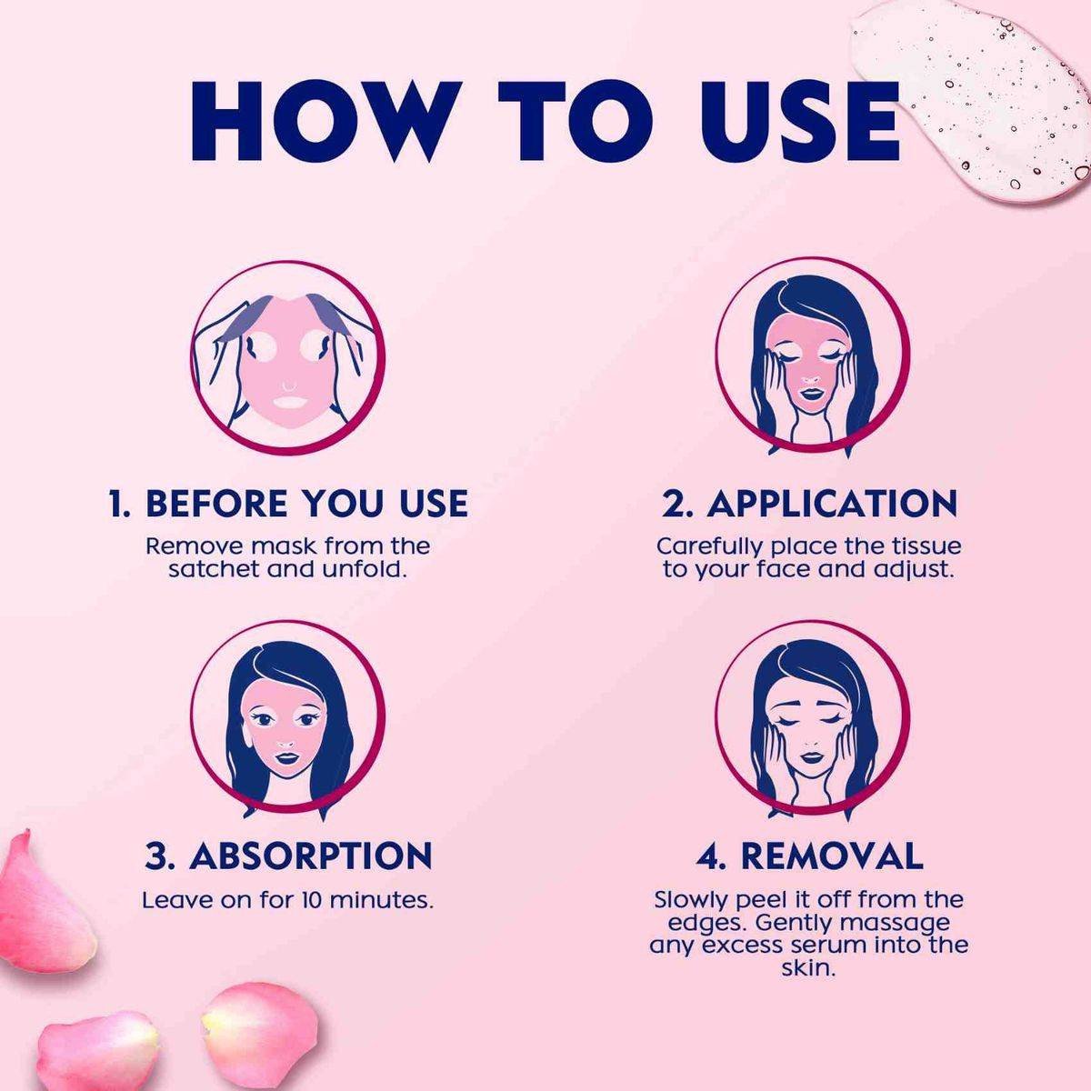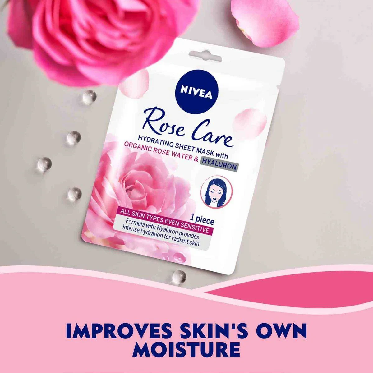 The NIVEA Rose Care Hydrating Face Sheet Mask is enriched with organic rose water and hyaluron, providing intense hydration for radiant skin. Suitable for all skin types, it combats daily stress and pollution, leaving skin healthy and moisturized in just 10 minutes. Key Features Enriched with organic rose water and hyaluron Intense hydration for radiant skin Improves skin's own moisture Suitable for all skin types, even sensitive Helps skin to look more radiant Aqua, Butylene Glycol, Propanediol, Betaine, Hydroxyacetophenone, Chondrus Crispus, Lithothamnium, Peg/Ppg-17/6 Copolymer, Peg/Ppg/Polybutylene Glycol-8/5/3 Glycerin, 1,2-Hexanediol, Xylitylglucoside, Anhydroxylitol, Xylitol, Glucose, Phenoxyethanol, Polyacrylic Acid, Peg-60 Hydrogenated Castor Oil, Arginine, Glycerin, Beta-Glucan, Caprylyl Glycol, Sodium Benzoate, Allantoin, Saccharide Isomerate, Citric Acid, Sodium Citrate, Xanthan Gum, Rosa Damascena Flower Water, Potassium Sorbate, Sorbic Acid, Hydroxyethylcellulose, Disodium Edta, Sodium Hyaluronate, Hydrolyzed Sodium Hyaluronate, Sodium Polyglutamate, Linalool, Geraniol, Citronellol, Limonene, Methyl Benzoate, Tocopherol, Parfum.Nivea: Trusted skincare brand known for nourishing and hydrating products.Remove Mask From Sachet And Unfold. Place On Face And Adjust. Leave On For 10 Minutes. Peel Off And Massage Excess Serum Into Skin.For external use only. Discontinue use if irritation occurs. Avoid applying to broken or irritated skin.