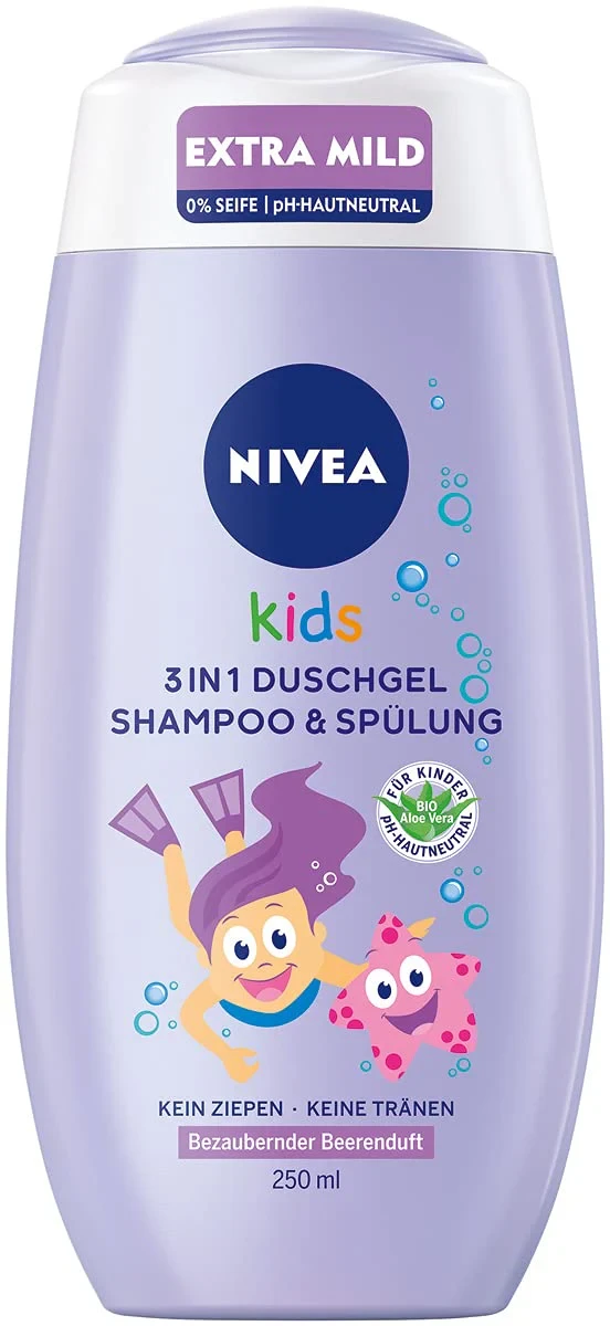 Nivea Kids 3in1 Shower Shampoo Conditioner offers a magic berry scent, perfect for gentle cleansing. Formulated with Aloe Vera, it ensures no tears and easy combing. Extra mild formula 0% soap pH skin neutral No tears No tangles Magic berry scent Bio Aloe Vera.Nivea: Trusted skincare brand known for gentle, effective products for all ages.Apply To Wet Hair And Body, Lather, And Rinse Thoroughly.For external use only. Avoid contact with eyes. If contact occurs, rinse thoroughly.