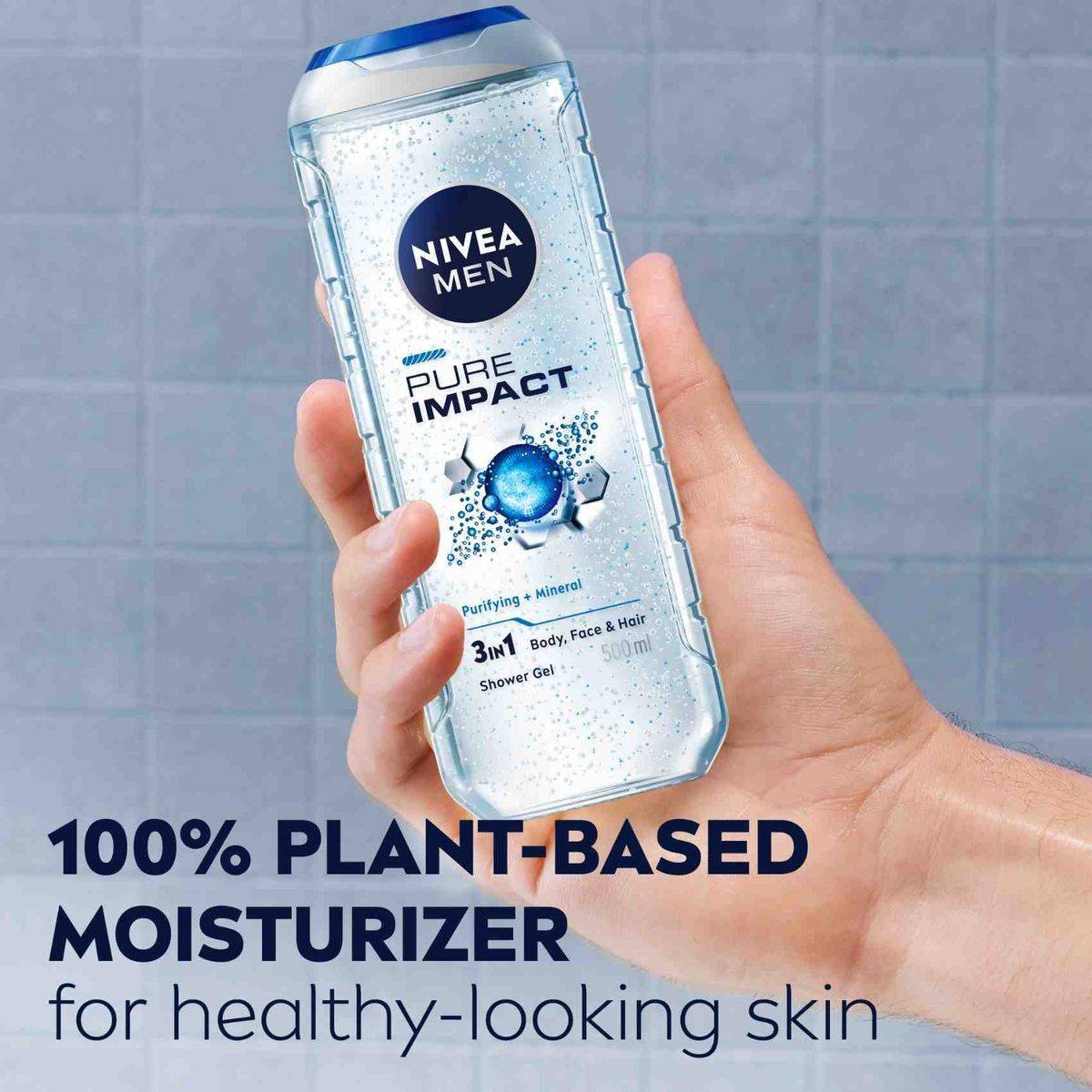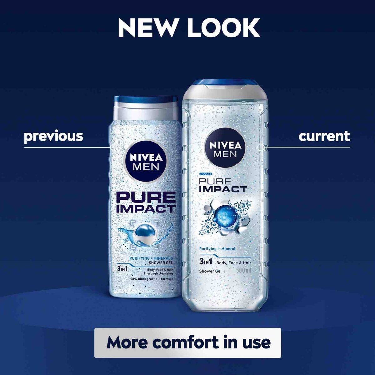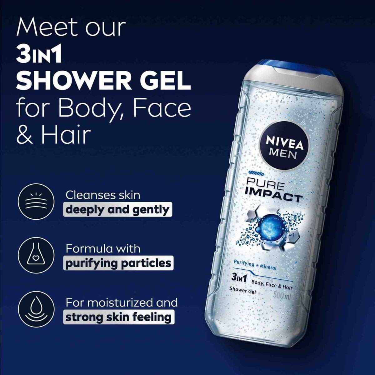 Nivea Men Pure Impact Shower Gel is a 3IN1 formula designed for body, face, and hair. It deeply cleanses with purifying particles, leaving skin refreshed and revitalized. Dermatologically approved for all skin types. Features