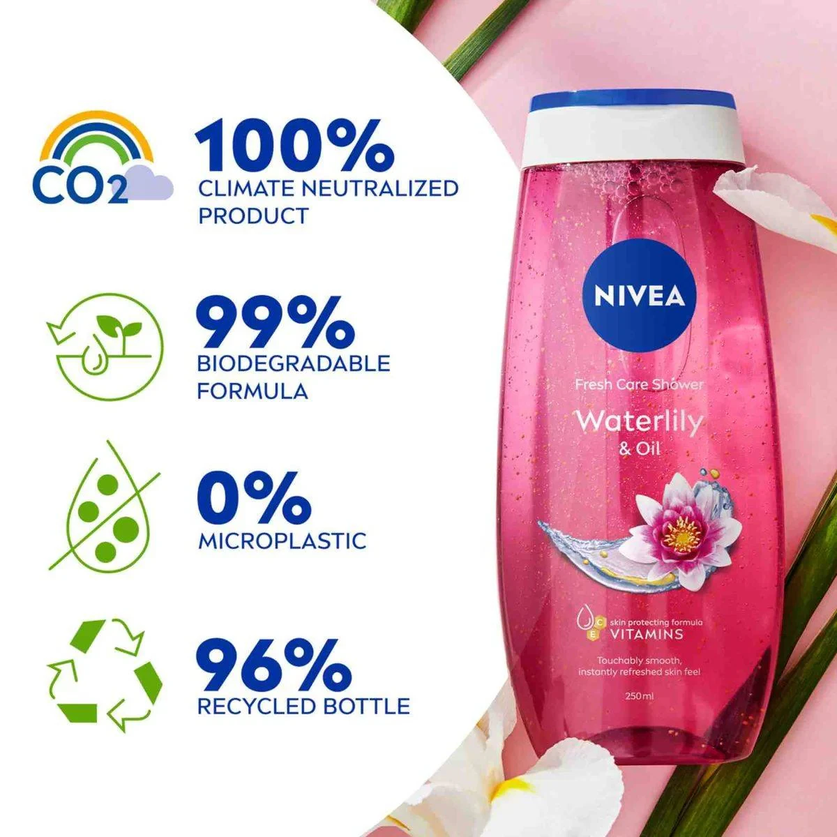 Nivea Shower Gel Waterlily & Oil offers a refreshing cleanse with caring oil pearls and a soothing waterlily scent. Its formula is 99% biodegradable and free from microplastics, ensuring a gentle touch on your skin and the environment. Ideal for daily use, it leaves your skin feeling soft and invigorated. Key Features
