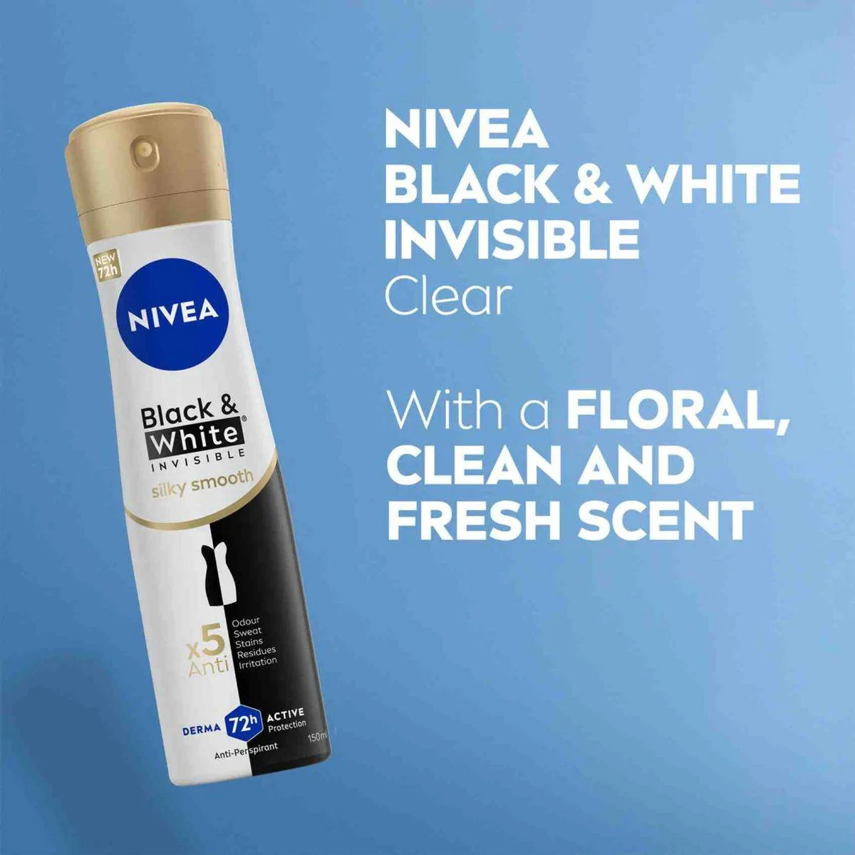 NIVEA Women Deodorant Spray Silky Smooth offers 48-hour protection against sweat and odor. Its innovative formula ensures black stays black and white stays white longer, while caring for your skin. Key Features 48-hour antiperspirant protection Anti-odour, anti-sweat, anti-stains Gentle on skin No ethyl alcohol Patented stain protection Suitable after hair removal Butane, Isobutane, Propane, Cyclomethicone, Aluminum Chlorohydrate, C12-15 Alkyl Benzoate, Isopropyl Palmitate, Palmitamidopropyltrimonium Chloride, Octyldodecanol, Propylene Glycol, Disteardimonium Hectorite, Propylene Carbonate, Dimethiconol, Benzyl Alcohol, Alpha-Isomethyl Ionone, Citronellol, Benzyl Salicylate, Parfum.NIVEA: Trusted skincare brand known for innovative antiperspirant solutions.Apply evenly on underarms for 48-hour protection.Avoid contact with eyes. In case of contact with eyes, rinse immediately with plenty of water and seek medical advice.