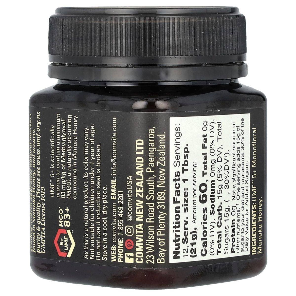 Comvita Manuka Honey UMF 5+ is a raw, wild, and unpasteurized honey from New Zealand. Certified by the UMF Honey Association, it contains MGO 83+, supporting immune health and digestive wellness. Key Features Raw, wild & unpasteurized Certified UMF™ 5+ Non-GMO Project Verified Product of New Zealand Contains MGO 83+ Supports immune system Rich in natural compounds Suitable for wellness rituals UMF™ 5+ Monofloral Manuka Honey.Comvita: Pioneers in Manuka Honey, offering raw, wild, and unpasteurized honey since 1974.Not SpecifiedNot suitable for children under 1 year of age.