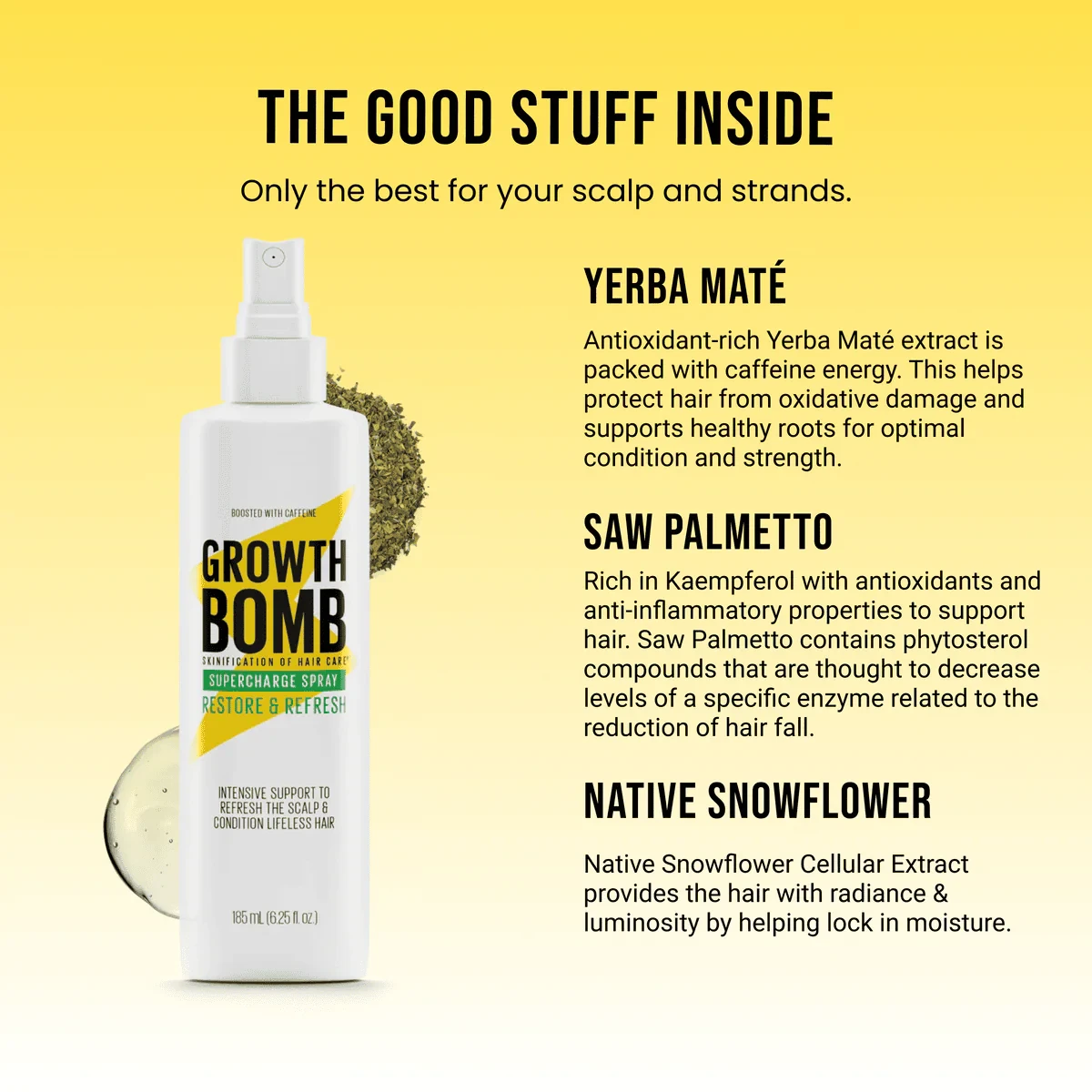 Growth Bomb Hair Growth Spray is a caffeine-infused leave-in treatment designed to invigorate the scalp and strengthen hair. Packed with natural ingredients like Yerba Maté and Peppermint Oil, it provides antioxidant protection and reduces breakage, leaving hair silky and manageable. Ideal for daily use on all hair types. Key Features
