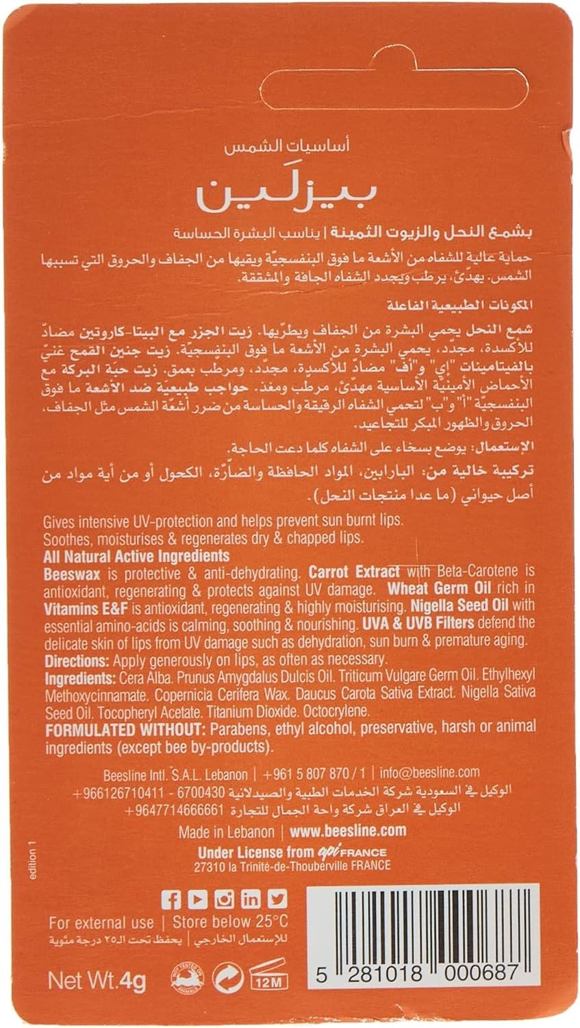 Beesline Lip Care Ultra Screen SPF30 is a premium lip balm offering intensive UV protection and moisture for dry, chapped lips. Formulated with natural ingredients like beeswax and precious oils, it soothes and regenerates lip skin, making it ideal for sensitive lips. Features Intensive UV protection with SPF 30+ Moisturizes and soothes dry lips Regenerates lip tissue Suitable for sensitive skin Natural ingredient formula Cera Alba (Beeswax), Prunus Amygdalus Dulcis (Sweet Almond) Oil, Triticum Vulgare (Wheat) Germ Oil, Ethylhexyl Methoxycinnamate, Copernicia Cerifera (Candelilla) Wax, Daucus Carota Sativa (Carrot) Extract, Nigella Sativa Seed Oil, Tocopheryl Acetate (Vitamin E), Titanium Dioxide, Octocrylene.Natural skincare brand specializing in lip care with sun protection.Apply generously onto lips before sun exposure and reapply as needed.Apply before sun exposure and reapply generously.