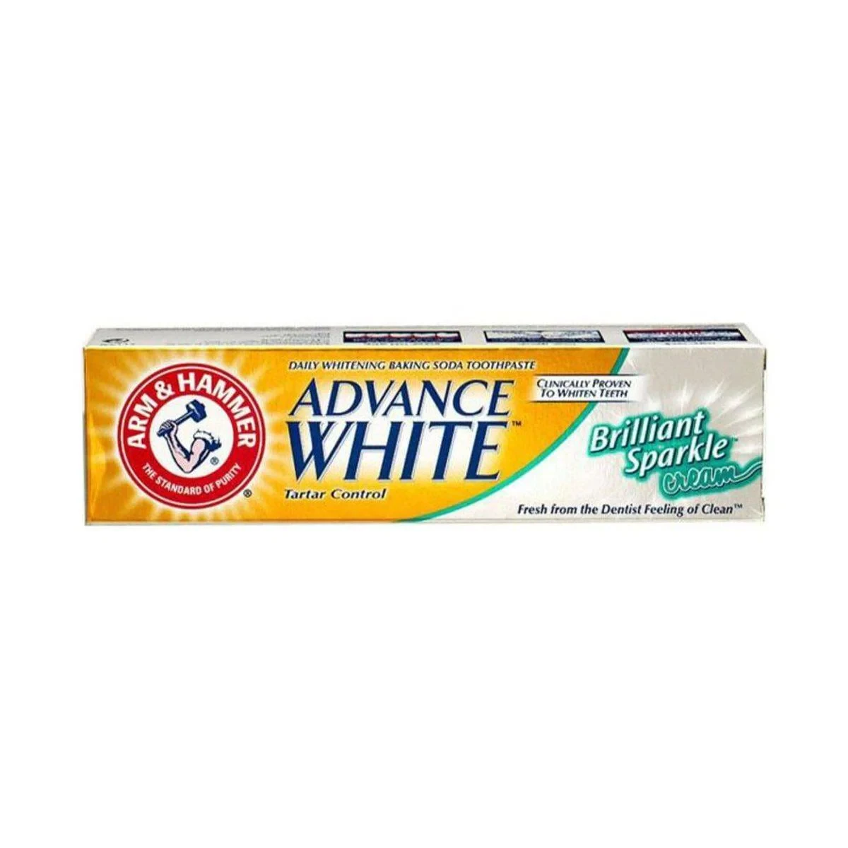 Arm & Hammer Toothpaste Advance White Brilliant Sparkle Cream offers a fresh-from-the-dentist feeling with its clinically proven formula to whiten teeth and control tartar. Features Clinically proven to whiten teeth Tartar control Brilliant sparkle cream Fresh from the dentist feeling Active Ingredient: Sodium Fluoride. Key Ingredients: Sodium Bicarbonate (Baking Soda), Water, Glycerin, Hydrated Silica, Flavor.Arm & Hammer: Known for its baking soda-based products, offering effective cleaning and whitening solutions.Brush Twice Daily For Optimal Results.Medicated Toothpaste: Do not swallow. Keep out of reach of children. If irritation occurs, discontinue use.