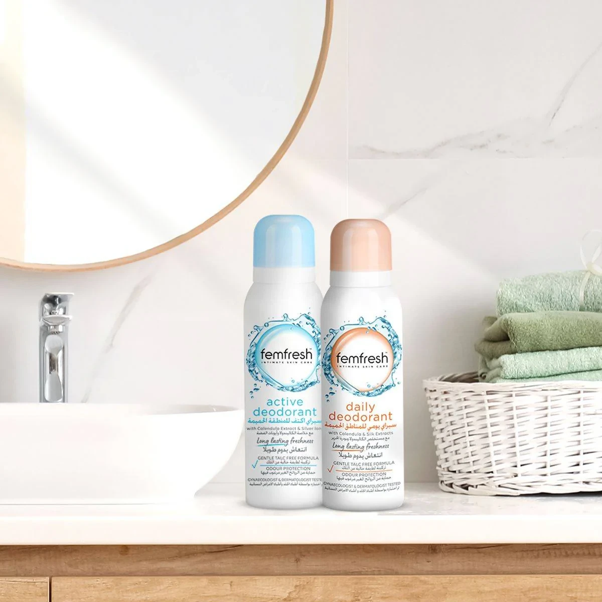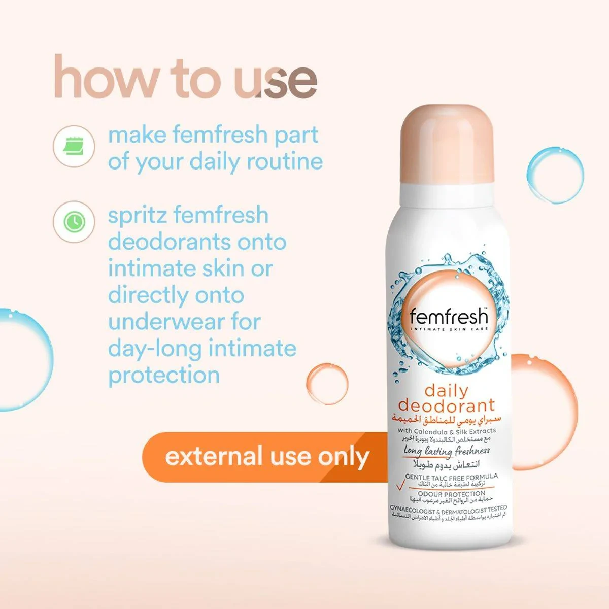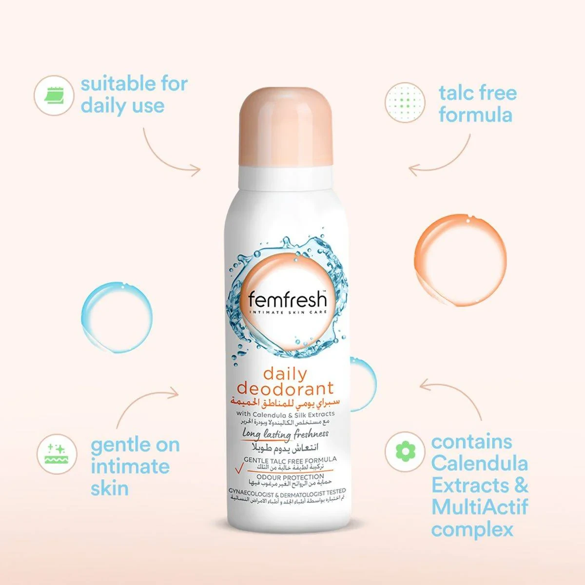 Femfresh Intimate Freshness Deodorant is a gentle, pH-balanced spray designed for daily use. It contains calendula and silk extracts for long-lasting freshness and odour protection. Dermatologically and gynecologically tested, it is safe for sensitive skin. Key Features
