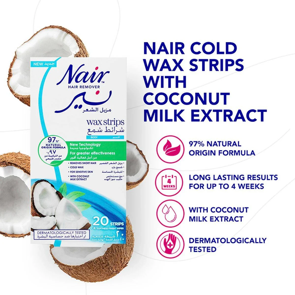 Nair Body Wax Strips Coconut 20 Pack offers a convenient hair removal solution with 97% natural origin formula. Ideal for sensitive skin, it includes coconut milk extract for a soothing experience. Dermatologically tested for safety and effectiveness. Key Features Removes short hair Cold wax for sensitive skin Contains coconut milk extract Dermatologically tested 97% natural origin formula Long-lasting results for up to 4 weeks 97% Natural Origin Formula, Coconut Milk Extract.Nair: Experts in hair removal solutions with natural ingredients for sensitive skin.Peel, Apply, Pull, Wipe & MoisturizeWAX WARNING: Always perform a patch test before use. Do not use on broken, irritated, or sunburnt skin. Wait 24 hours before applying deodorant/perfume. Keep out of reach of children.