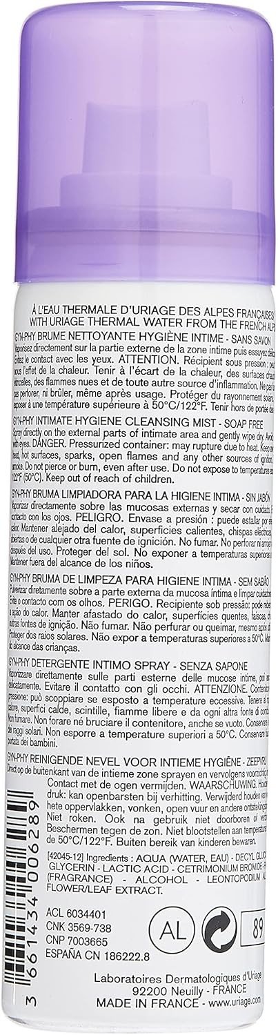 Uriage Gyn Phy Refreshing Intimate Hygiene Mist is designed for daily use, offering gentle cleansing and hydration for sensitive intimate areas. Its soap-free formula is tested under gynecological control, ensuring comfort and safety. Features Suitable for sensitive intimate area Soap-free Physiological pH (5.5) Gently cleanses Refreshes & hydrates Soothes sensations of discomfort Daily use Rinse-free Hypoallergenic Key Ingredients: Water, Uriage Thermal Water, Glycols, Lactic Acid (pH balancer), Mild Surfactants, Fragrance.Uriage: Experts in thermal skincare solutions, offering gentle and effective products for sensitive skin.Apply As Needed To The Intimate Area. No Rinsing Required.For external use only. Avoid contact with eyes. Discontinue use if irritation occurs.