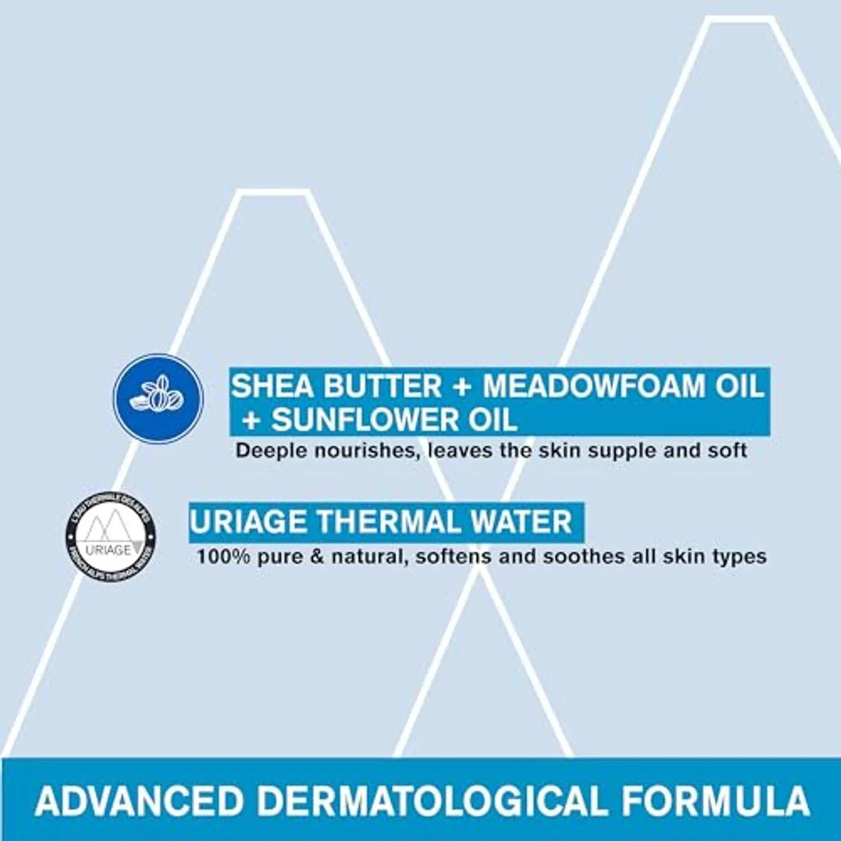 Uriage Moisturizing Cleansing Cream is a gentle cleanser enriched with Uriage Thermal Water, Shea Butter, and Meadowfoam Oil. It nourishes and protects sensitive skin, suitable for face, body, and hair. Dermatologically tested, it respects the skin's hydrolipidic film. Key Features Dermatologically tested Soap-free Physiological pH (5.5) 92% ingredients of natural origin Mild foaming nourishing cream Suitable for face, body, and hair All skin types, even sensitive Contains Uriage Thermal Water Aqua (Water, Eau), Magnesium Laureth Sulfate, Decyl Glucoside, Glycerin, Cocamidopropyl Betaine, Parfum (Fragrance), Styrene/Acrylates Copolymer, Sodium Chloride, Peg-120 Methyl Glucose Dioleate, Dmdm Hydantoin, Citric Acid, Shorea Stenoptera Seed Butter.Uriage: Dermatologically tested skincare with natural ingredients.Lather Well On Damp Skin And Rinse Off.For external use only. Avoid contact with eyes. If contact occurs, rinse immediately.