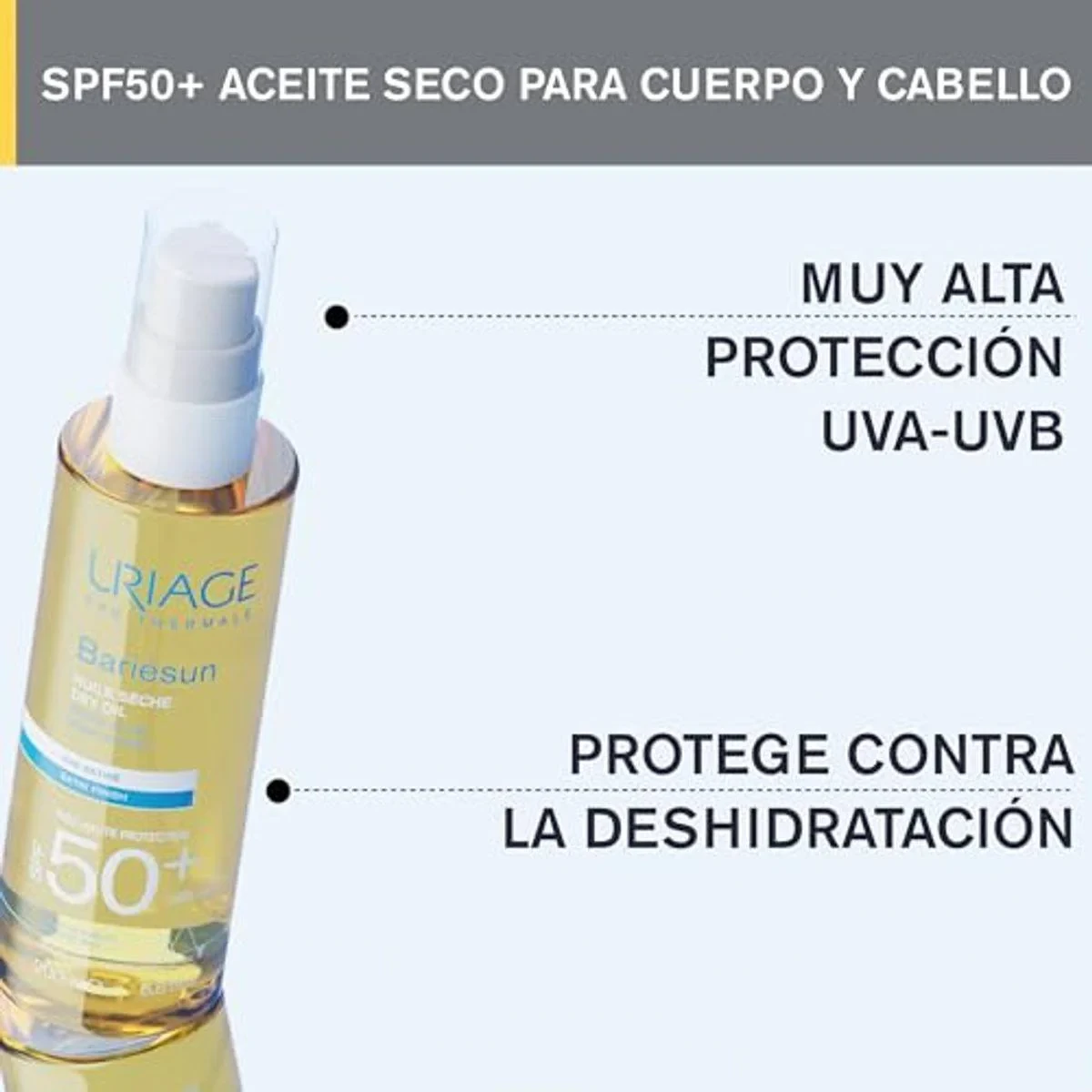 Uriage Bariesun Dry Oil SPF50 is a non-sticky, high-protection sunscreen for sensitive skin. It hydrates and protects against UVA/UVB rays and oxidative stress. Suitable for body and hair. Key Features