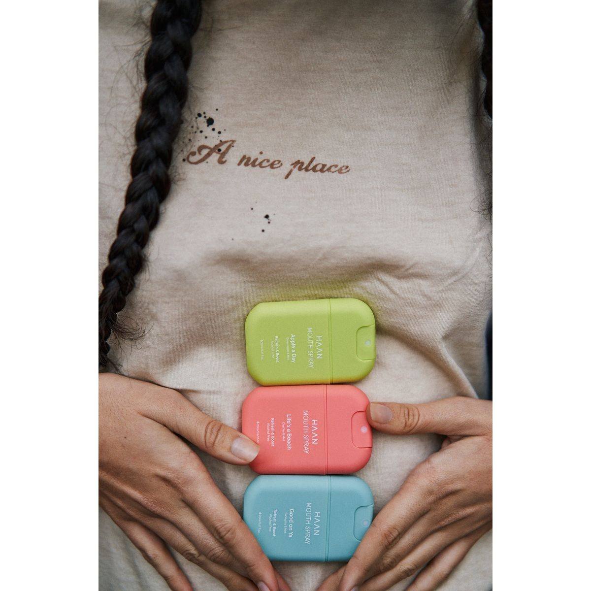 Haan Mouth Spray Life's A Beach Mini 20ml is a refreshing, alcohol-free mouth spray with Chai Tea and Mint flavors. Designed to uplift your mood and provide long-lasting fresh breath, it is cruelty-free and vegan. Ideal for on-the-go freshness, this travel-friendly spray boosts confidence with every spritz. Features Alcohol-free Chai Tea & Mint flavor Vegan and cruelty-free Travel-friendly size Boosts confidence with fresh breath Recyclable and refillable container Aqua, Sorbitol, Glycerin, Polysorbate 20, Menthol, Mentha Arvensis Herb Oil, Xylitol, Inulin, Fructose, Sodium Saccharin, Aroma, Sodium Benzoate, Potassium Sorbate, Tetrasodium Glutamate Diacetate, Cinnamal, Eugenol, Limonene.Innovative personal care brand known for eco friendly, alcohol free mouth sprays with refreshing flavors.Spray once or twice after a cup of coffee, before an important meeting, or when you want fresh and confident breath. Do not rinse your mouth afterwards.Do Not Swallow. Keep Out Of Reach Of Children.