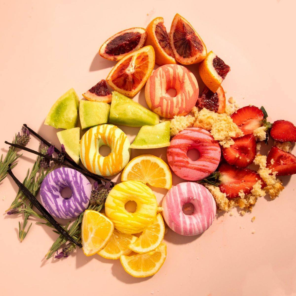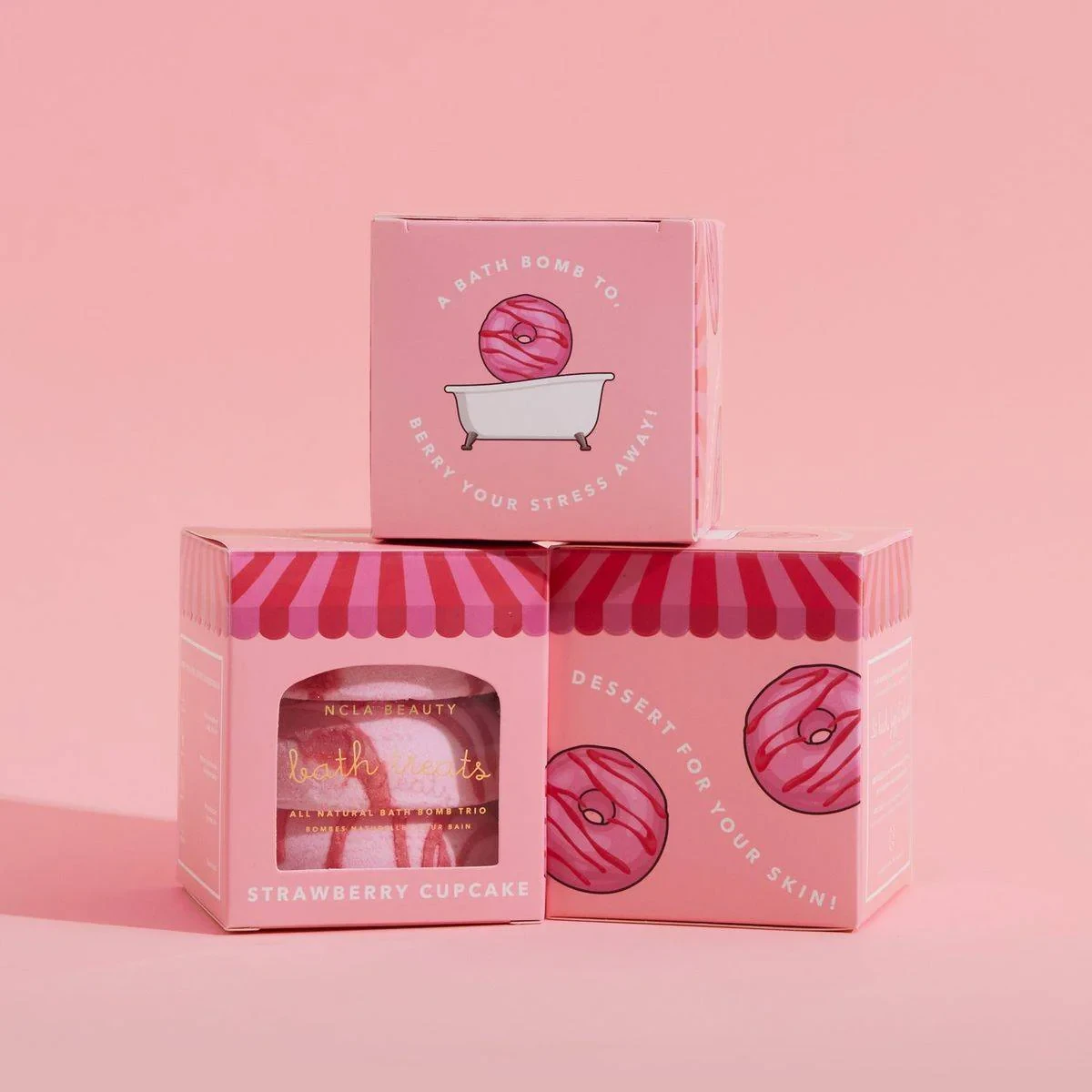 This handmade bath bomb trio leaves skin ultra-soft and smelling delicious. Infused with essential oils for an aromatherapeutic bath experience. Made with nourishing ingredients like Epsom salt, kaolin clay, and shea butter. Proudly made in the USA with all-natural, vegan ingredients. Features Handmade bath bomb trio Leaves skin ultra-soft Strawberry cake scent Infused with essential oils Donut-shaped bath treats Contains Epsom salt and kaolin clay Hydrating and nourishing Vegan and all-natural ingredients Sodium Bicarbonate, Citric Acid, Organic Shea Butter, White Kaolin Clay, Essential Oil Blend, Polysorbate 80, Isopropyl Alcohol, Epsom Salt, Mica-Colorant.Innovative beauty brand specializing in vegan, cruelty-free bath and body products.Fill the tub with warm water and drop in one bath bomb. Let the fizz do the rest and enjoy the delicious smells and hydrating bath.For external use only. Adult supervision required for young children. If irritation occurs, discontinue use.