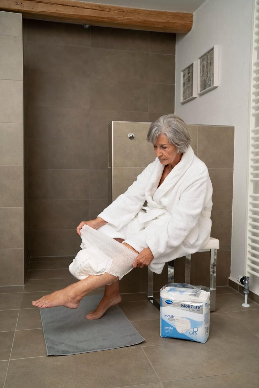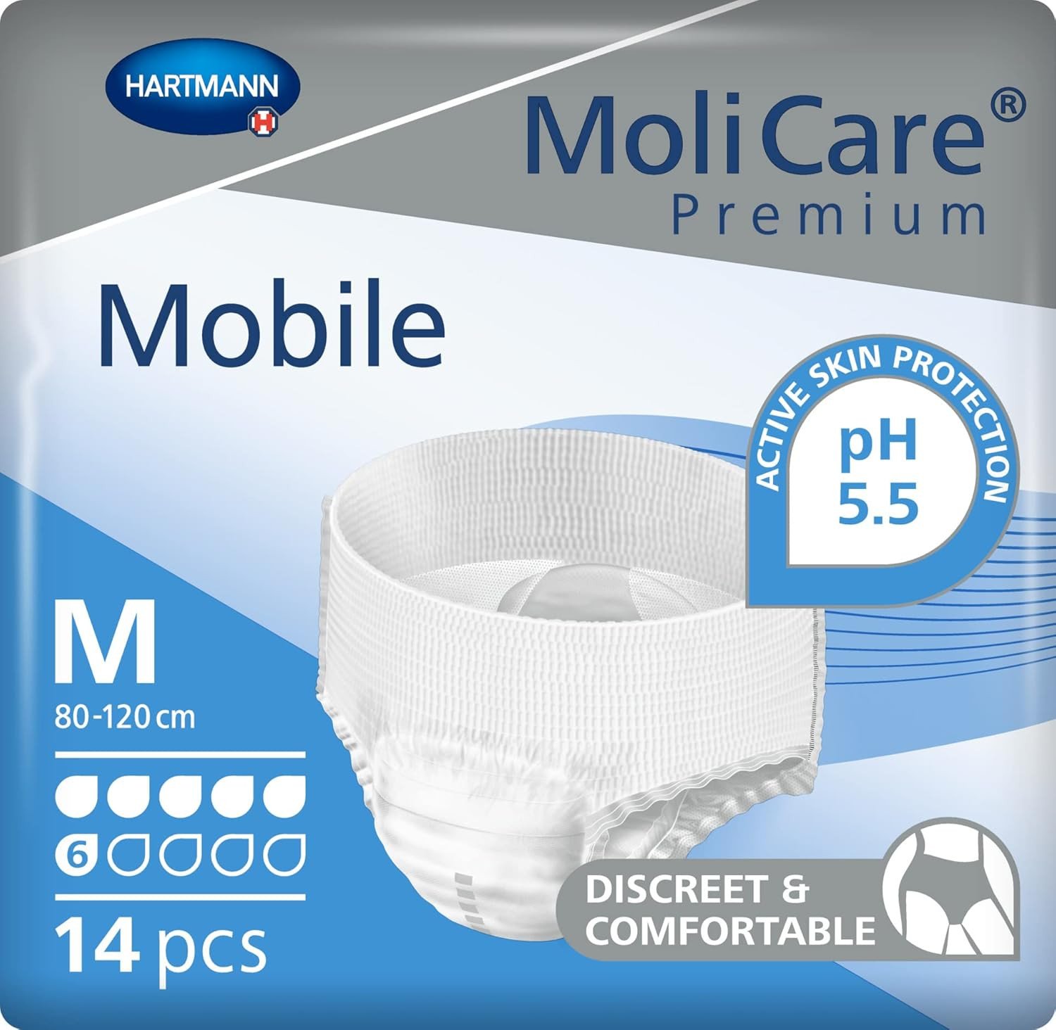 MoliCare Premium Mobile Pull-Up Pants are designed for moderate to heavy incontinence, offering a discreet, comfortable fit. Featuring a 3-layer absorbent core, they maintain skin pH and reduce irritation risk. Ideal for both men and women, these pants provide ease of use with tear-open side seams. Key Features Moderate to heavy incontinence protection Unisex, underwear-like fit 3-layer absorbent core Odour neutralizers Soft, textile-like materials Easy tear-open sides Breathable, skin-friendly materials Anti-leakage cuffs Maintains skin pH Discreet and comfortable Key Materials: Absorbent Core (SAP/Pulp), Non-woven layers, Elastic, breathable pants/waistband, Odor neutralizers.MoliCare: Innovators in incontinence care, offering discreet and comfortable solutions for all-day protection.Ensure colored elastic threads are at the front. Help the wearer step into the pants one leg at a time. Pull pants up to the waist so they fit snugly. Replace pants when the wetness indicator fades. To remove, tear side seams and slide down pants. Dispose of used pants in normal waste.If symptoms persist, consult your healthcare practitioner.